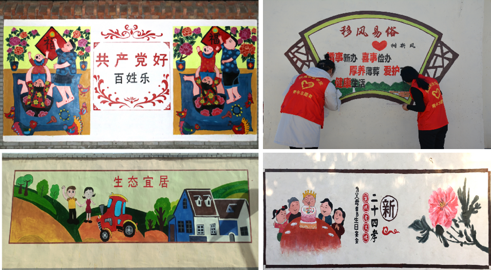 自2019 年以來(lái),學(xué)院堅(jiān)持“立足地方、融入地方、服務(wù)地方”的發(fā)展理念,組織師生開(kāi)展“打造人文美居助力鄉(xiāng)村振興”墻體彩繪志愿服務(wù)項(xiàng)目,通過(guò)墻體彩繪反映黨的領(lǐng)導(dǎo)下農(nóng)村精神風(fēng)貌的變化和取得的成就,將村莊重點(diǎn)街巷屋面墻體繪制出一幅幅反映美麗鄉(xiāng)村建設(shè)、社會(huì)主義核心價(jià)值觀、移風(fēng)易俗、鄉(xiāng)風(fēng)文明等為主題的墻體畫(huà),形象生動(dòng)、展現(xiàn)了農(nóng)村新生活、農(nóng)業(yè)新氣象、農(nóng)民新面貌,美化了村容村貌,為美麗鄉(xiāng)村建設(shè)、人居環(huán)境美化添磚加瓦。