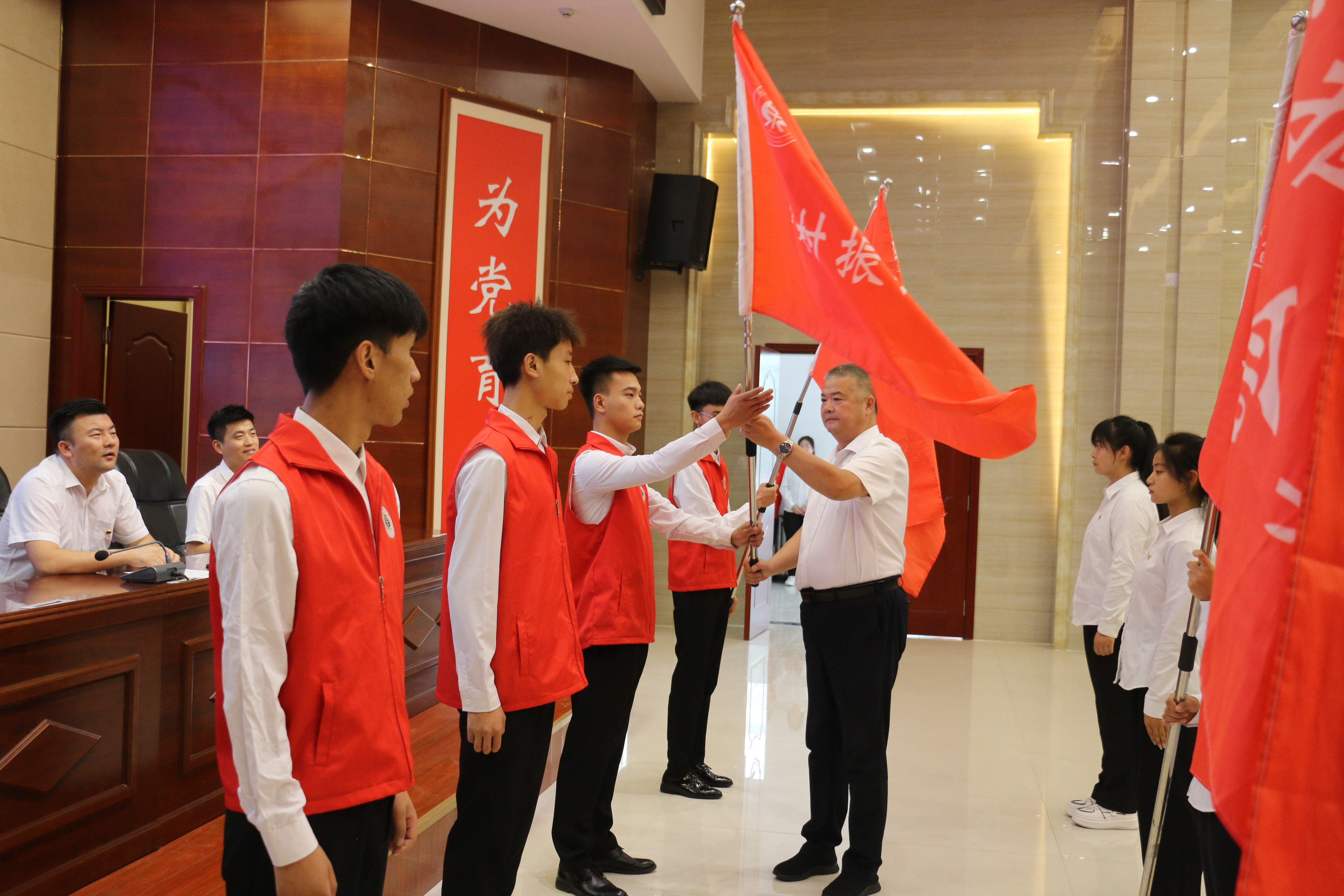 王守云為各實(shí)踐服務(wù)團(tuán)隊(duì)授旗。志愿者代表候昊燁代表全體隊(duì)員莊嚴(yán)承諾,遵守紀(jì)律,克服困難,團(tuán)結(jié)協(xié)作,全力以赴,力爭(zhēng)圓滿地完成預(yù)定的各項(xiàng)實(shí)踐任務(wù)。指導(dǎo)教師代表姚盈老師發(fā)言,介紹了“直播帶貨-非遺傳承”鄉(xiāng)村振興促進(jìn)團(tuán)的實(shí)踐計(jì)劃情況,號(hào)召老師和同學(xué)們深入基層一線,用腳步丈量祖國(guó)大地,用眼睛發(fā)現(xiàn)中國(guó)精神,用耳朵傾聽人民呼聲,用內(nèi)心感應(yīng)時(shí)代脈搏。