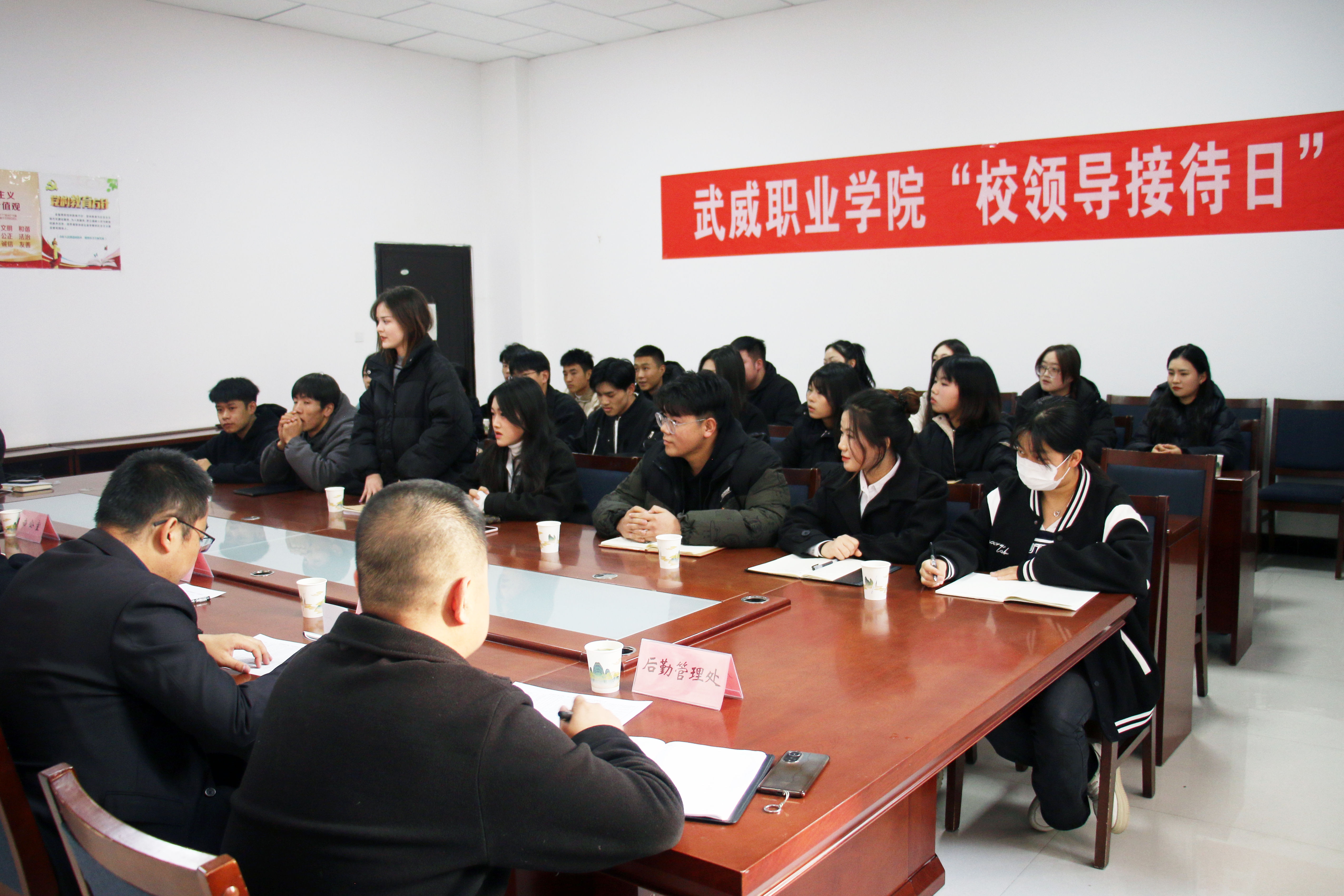 為切實(shí)做好“四下基層”工作,保障學(xué)生權(quán)益,進(jìn)一步營(yíng)造民主和諧的校園氛圍,提高校園服務(wù)質(zhì)量和管理水平,學(xué)校于11月24日下午在學(xué)生發(fā)展中心103會(huì)議室舉辦了2023-2024學(xué)年第一期“校領(lǐng)導(dǎo)接待日”活動(dòng)。校長(zhǎng)、黨委副書記張開禮與來自各二級(jí)學(xué)院的22名學(xué)生代表進(jìn)行了親切交流,辦公室、教務(wù)處、學(xué)生工作處、后勤管理處等相關(guān)部門負(fù)責(zé)人參加了活動(dòng)。