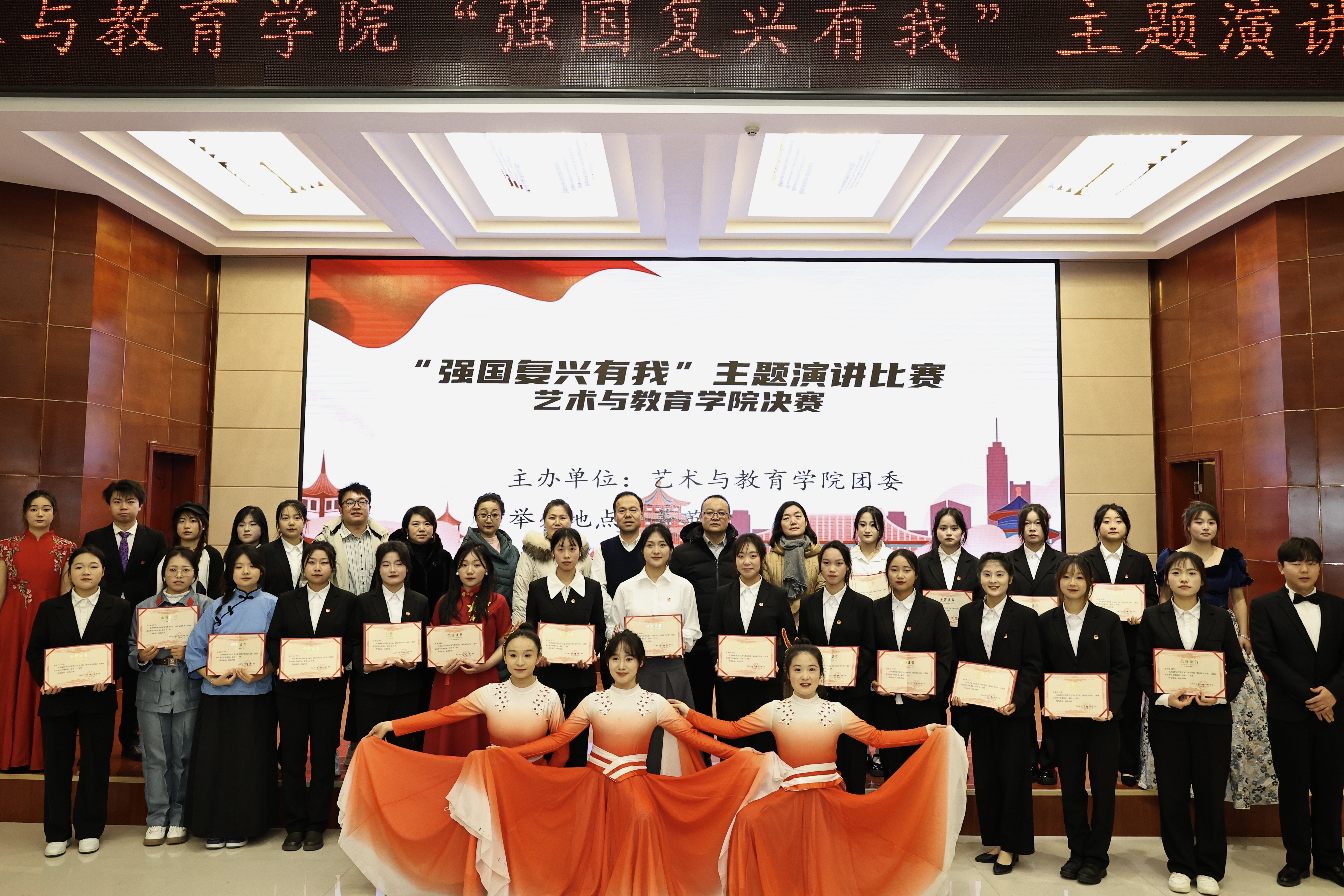 為弘揚(yáng)愛(ài)國(guó)主義精神,激發(fā)學(xué)生愛(ài)國(guó)情懷,12月20日晚,藝術(shù)與教育學(xué)院團(tuán)委在菁英廳舉辦“強(qiáng)國(guó)復(fù)興有我”主題演講比賽。學(xué)院200余名師生觀看了比賽。