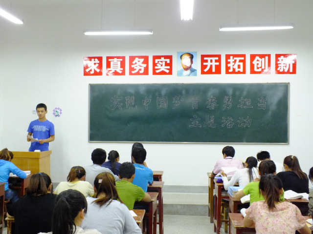 2013年5月20日,藥學系組織全體班團干部在4號教學樓410教室開展了“實現中國夢,青春勇擔當”的主題班團干部會活動,同學們認真聆聽了習近平在同各界優(yōu)秀青年代表座談時的講話,習近平強調,青年最富有朝氣,最富有夢想,青年興則國興,青年強則國強。