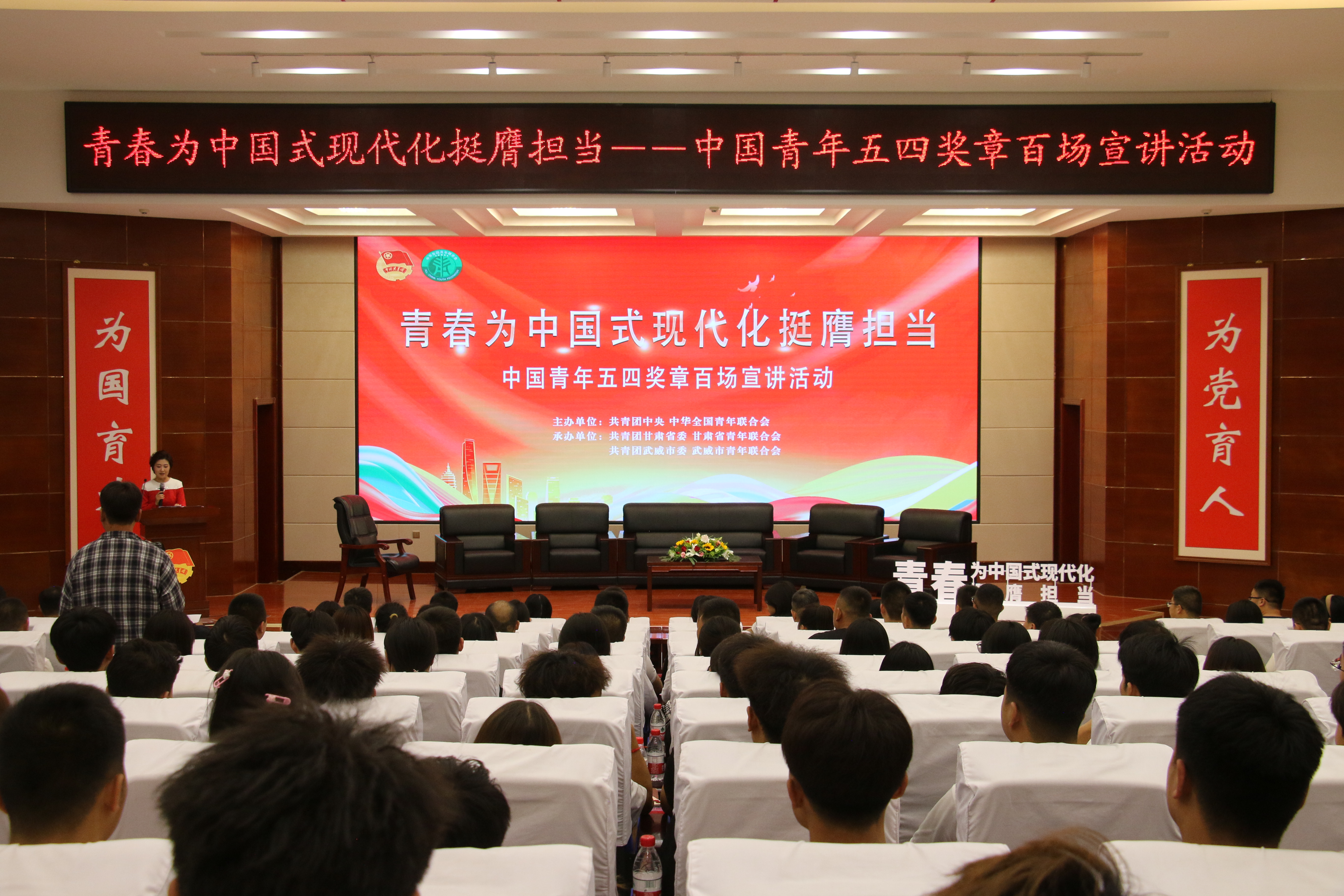 6月13日,“青春為中國式現(xiàn)代化挺膺擔(dān)當(dāng)”中國青年五四獎?wù)掳賵鲂v活動(武威站)在學(xué)校菁英廳成功舉辦。活動邀請第28屆中國青年五四獎?wù)芦@得者郭璽、第28屆甘肅青年五四獎?wù)芦@得者王延鵬、武威青年五四獎?wù)芦@得者吳劍斌及新時代武威好青年獲得者周睿、李廷澤、許斌開展宣講。學(xué)校優(yōu)秀學(xué)生代表共計(jì)130余人參加報告會。