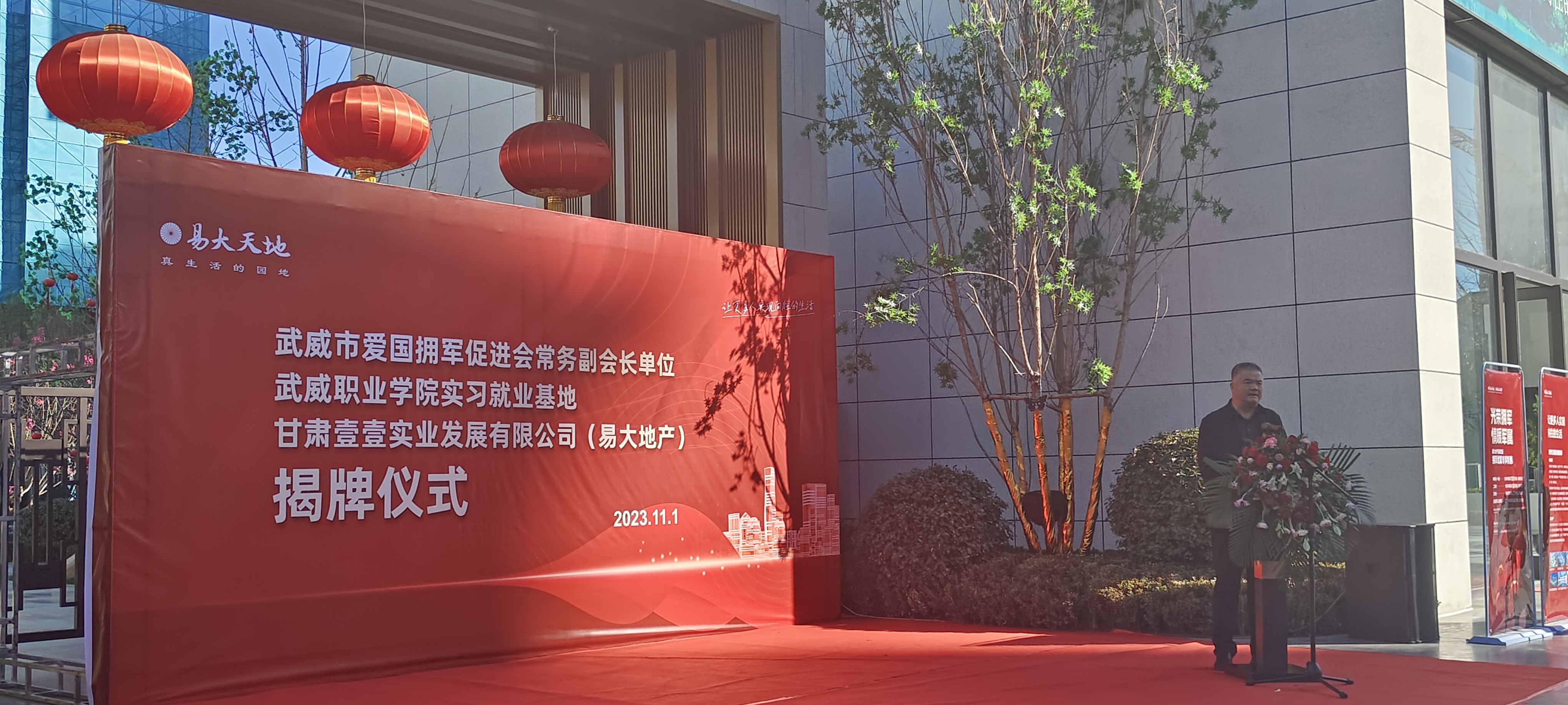 2023年11月1日,武威職業(yè)學(xué)院實(shí)習(xí)就業(yè)基地揭牌儀式在甘肅壹壹實(shí)業(yè)發(fā)展有限公司易大天地項(xiàng)目部舉行。學(xué)校黨委委員、副校長(zhǎng)王守云,公司總經(jīng)理滕澤民,學(xué)校招生就業(yè)處和工程技術(shù)學(xué)院師生代表50余人參加活動(dòng)。