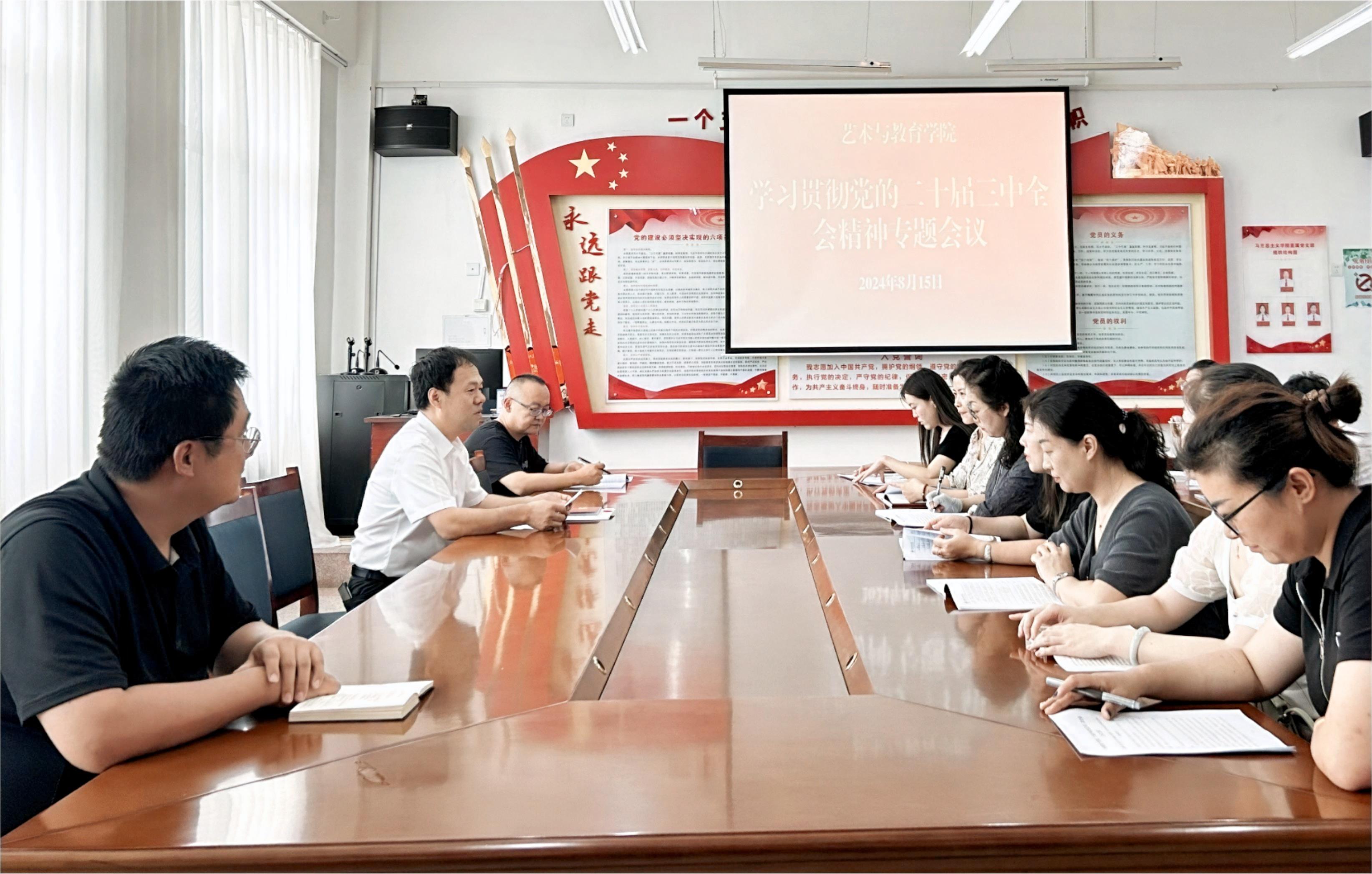 8月15日,藝術(shù)與教育學(xué)院召開黨的二十屆三中全會(huì)精神專題學(xué)習(xí)會(huì)議,傳達(dá)學(xué)習(xí)《習(xí)近平總書記關(guān)于<中共中央關(guān)于進(jìn)一步全面深化改革、推進(jìn)中國式現(xiàn)代化的決定>的說明》《中國共產(chǎn)黨第二十屆中央委員會(huì)第三次全體會(huì)議公報(bào)》《中共中央關(guān)于進(jìn)一步全面深化改革推進(jìn)中國式現(xiàn)代化的決定》,以及《深化教育綜合改革》等內(nèi)容。會(huì)議由學(xué)院黨總支書記王政主持,全體教職工參加會(huì)議。