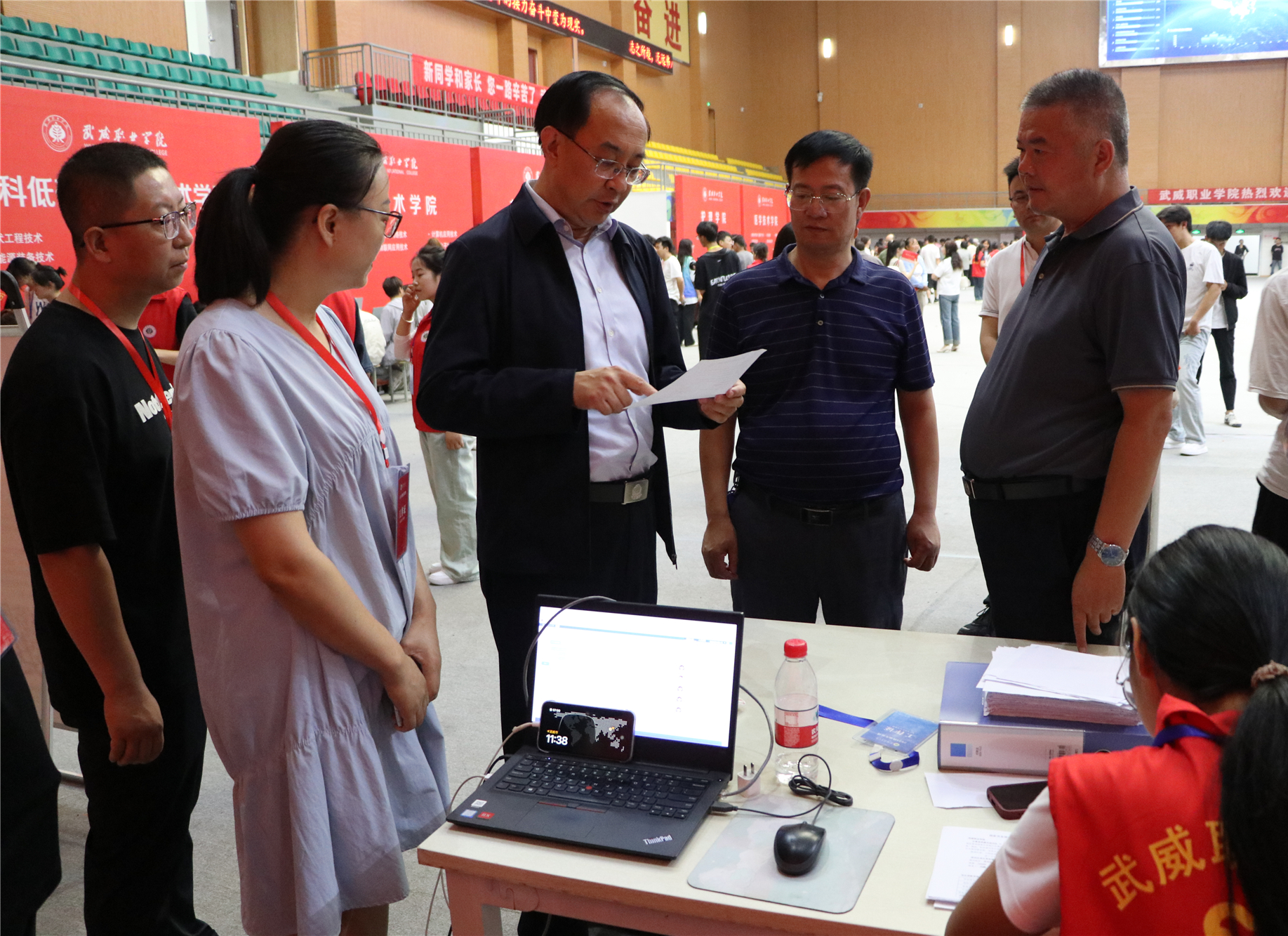 校領導一一走過新生報到處、綠色通道、繳費處和各二級學院迎新報到點,了解新生報到情況,仔細詢問智慧學工平臺使用情況,親切問候堅守崗位的師生志愿者。在醫(yī)學技術學院報到點前,王宏與2024級放射治療技術(重離子方向)新生及家長聊了起來——“歡迎你們來到武威職業(yè)學院學習!為什么會報考這個專業(yè)?”在得知學生家庭中有人從事重離子醫(yī)療領域的研發(fā)工作時,王宏勉勵新生要努力學好專業(yè)、練好技能,爭做高素質(zhì)技術技能人才。在家長休息區(qū),王宏與來自甘肅慶陽的新生家長親切交談,并介紹了學校的辦學情況,建議學生和家長在校園里走一走看一看,多了解熟悉學校,幫助學生盡快適應大學生活,并祝愿學生家長在武期間,一切順利。