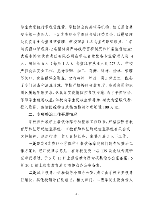 武威職業(yè)學(xué)院學(xué)生餐飲保障突出問題自查自糾工作總結(jié)