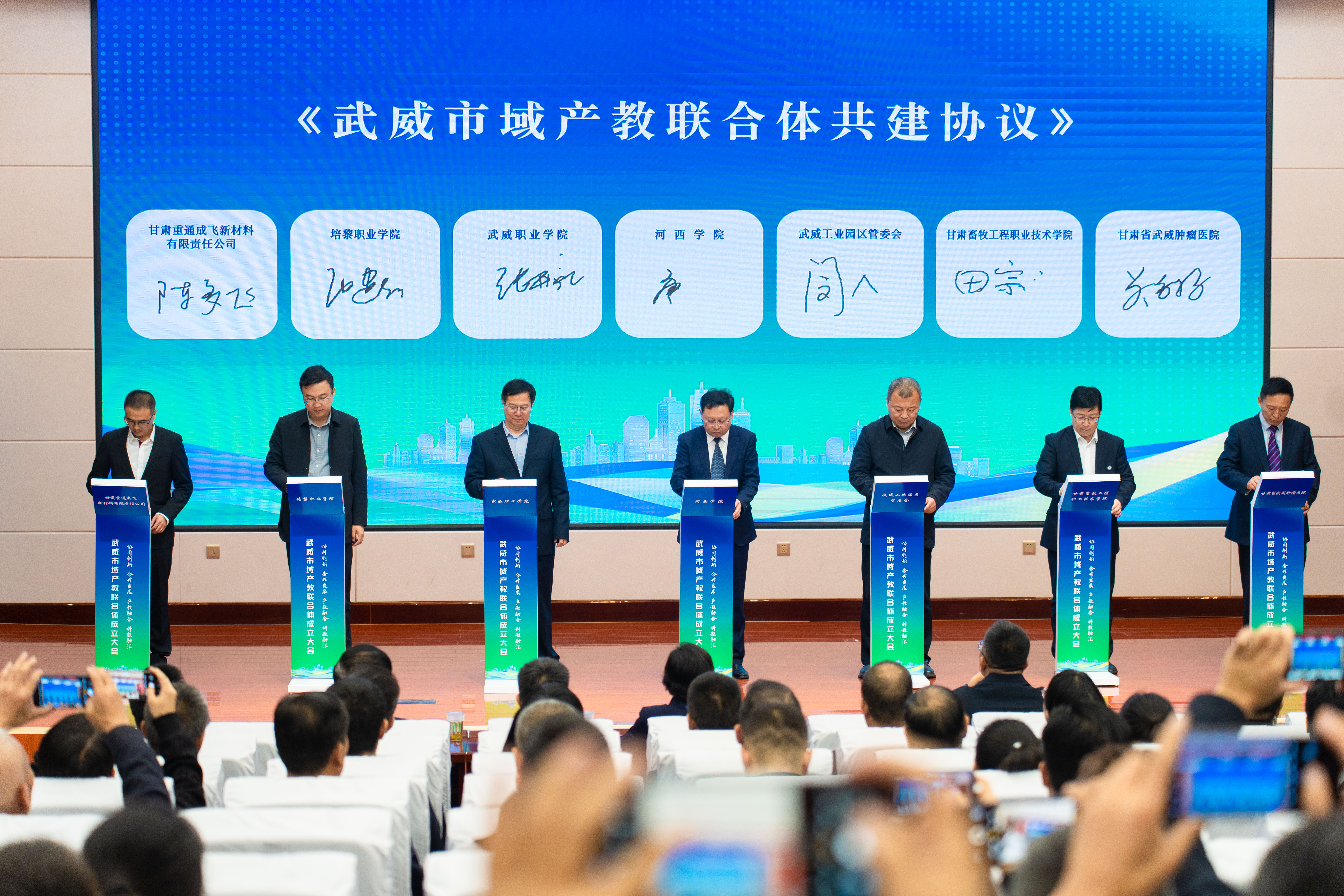 黨委書(shū)記王宏代表學(xué)校作為常務(wù)副理事長(zhǎng)單位在大會(huì)上致辭,校長(zhǎng)、黨委副書(shū)記張開(kāi)禮與聯(lián)合體單位代表共同簽署《武威市域產(chǎn)教聯(lián)合體共建協(xié)議》。