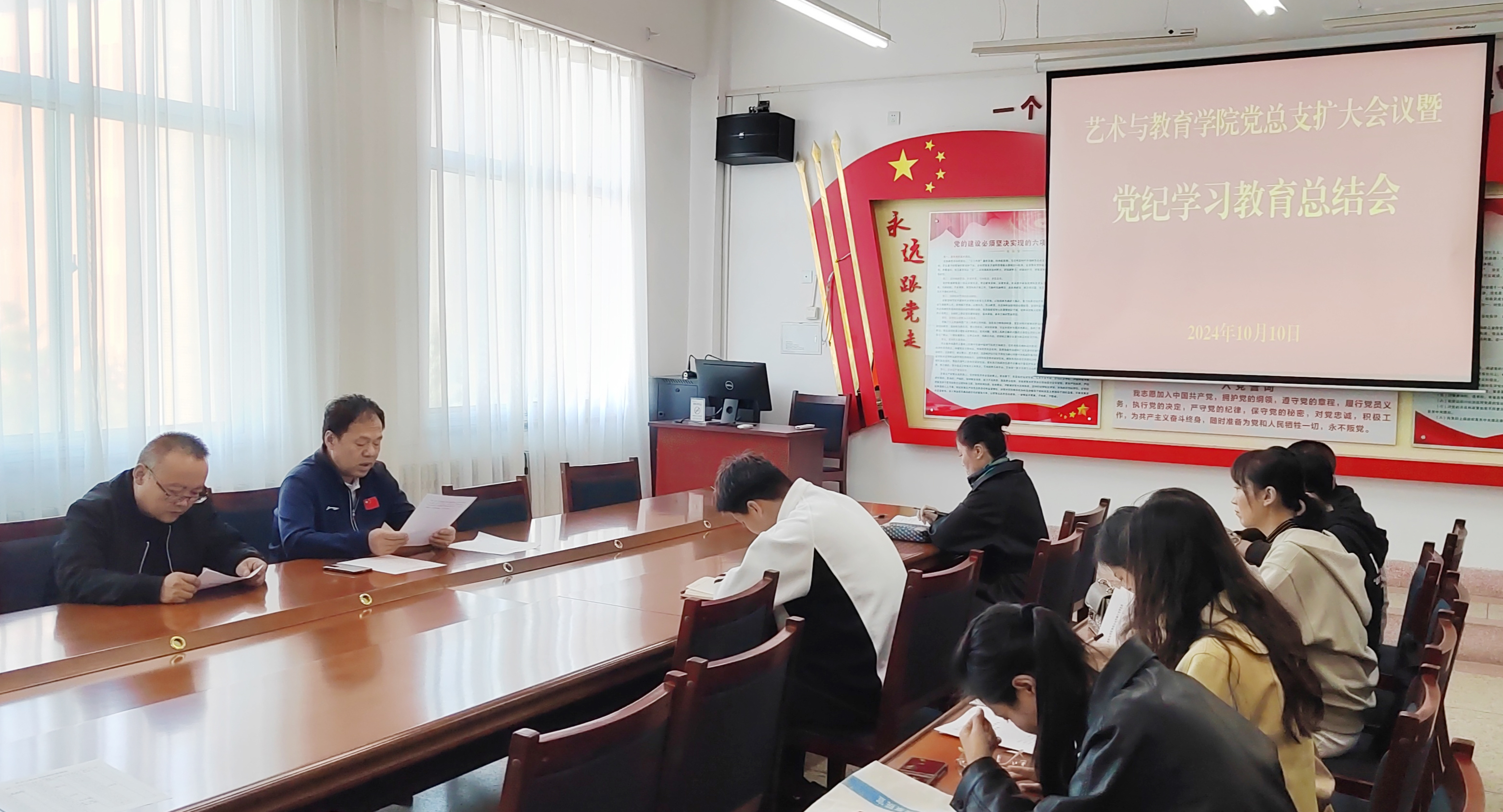 10月10日下午,學(xué)院黨總支擴大會議在勵勤樓209會議室舉行,會議學(xué)習(xí)傳達了習(xí)近平總書記在甘肅考察時的關(guān)于黨紀學(xué)習(xí)教育的重要講話和指示精神,黨的二十屆三中全會審議通過的《中共中央關(guān)于進一步全面深化改革、推進中國式現(xiàn)代化的決定》中關(guān)于黨紀學(xué)習(xí)教育的有關(guān)內(nèi)容和中央、省委、市委、學(xué)校黨委黨紀學(xué)習(xí)教育總結(jié)大會精神,總結(jié)了藝術(shù)與教育學(xué)院黨總支黨紀學(xué)習(xí)教育開展情況。會議由黨總支書記王政主持,學(xué)院各黨支部委員參加,全體行政人員列席。