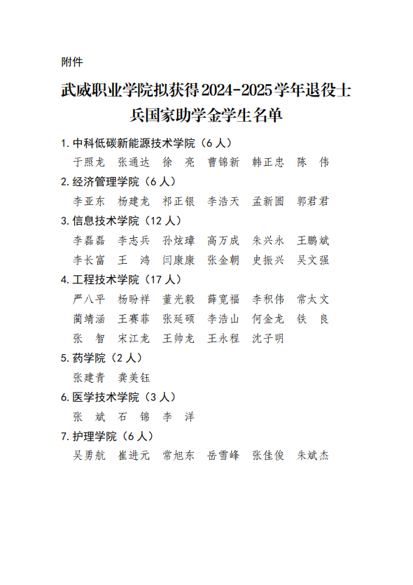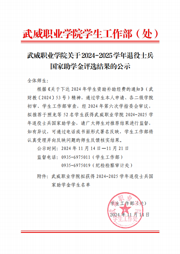 2024-2025學(xué)年武威職業(yè)學(xué)院退役士兵國(guó)家助學(xué)金公示