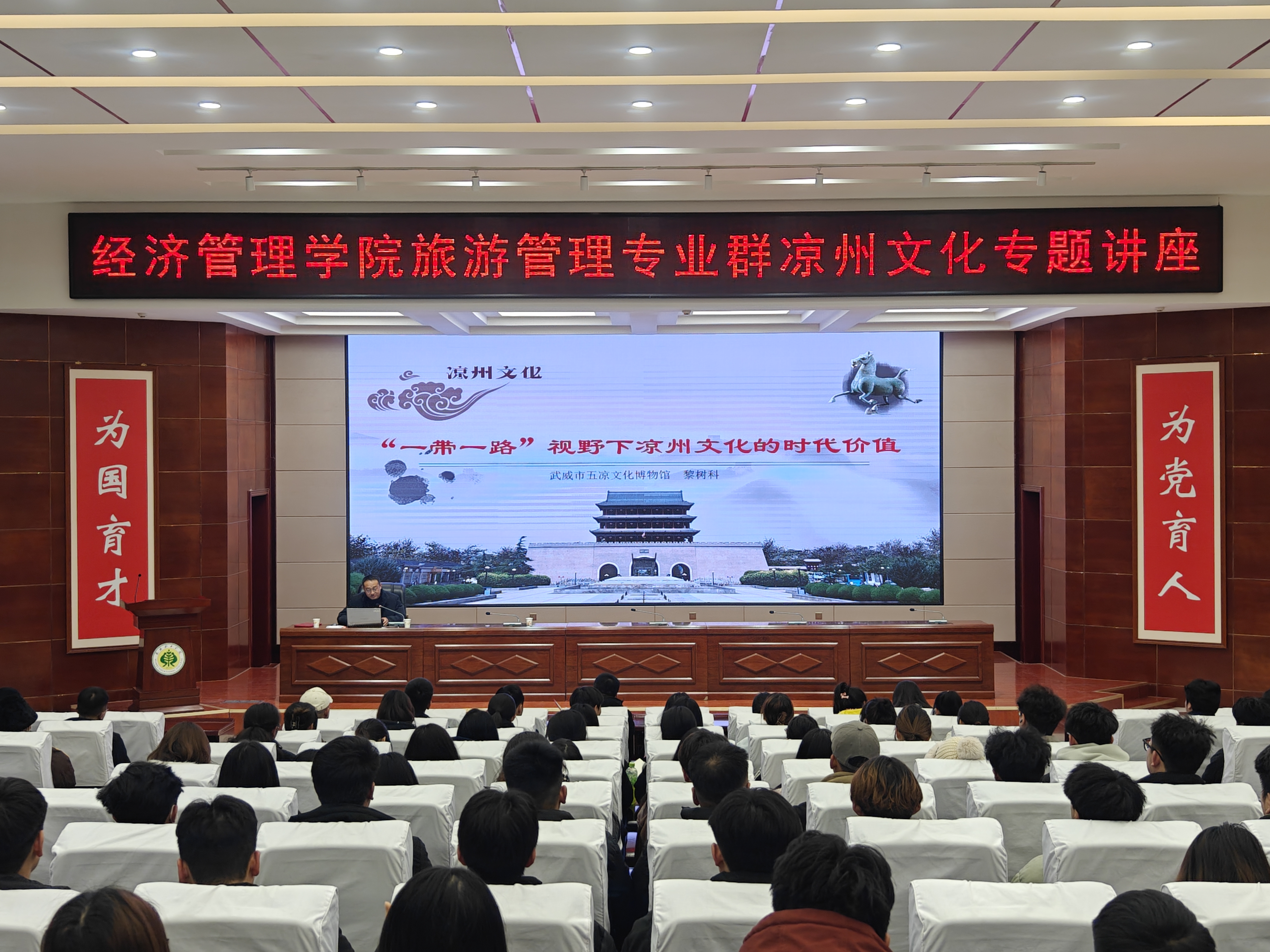12月11日下午,經(jīng)濟(jì)管理學(xué)院邀請武威市五涼文化博物館館長黎樹科開展了以《“一帶一路” 視野下涼州文化的時代價值》為主題的講座,旨在深入貫徹文化傳承發(fā)展戰(zhàn)略,加強(qiáng)傳統(tǒng)文化的弘揚(yáng)與教育。學(xué)院近200名師生參加此次講座。