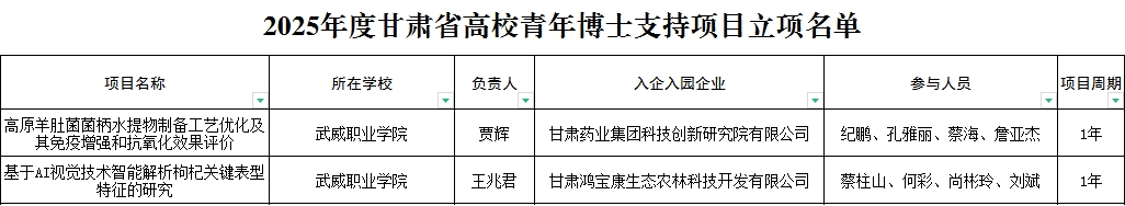 近日,甘肅省教育廳公布了2025年度甘肅省高校青年博士支持項目評審結(jié)果公示,我校賈輝博士主持的《高原羊肚菌菌柄水提物制備工藝優(yōu)化及其免疫增強和抗氧化效果評價》和王兆君博士主持的《基于AI視覺技術(shù)智能解析枸杞關(guān)鍵表型特征的研究》2個研究項目成功獲批。