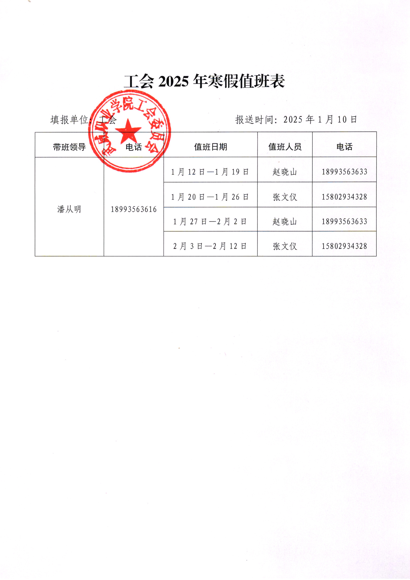 工會2025年寒假值班安排表