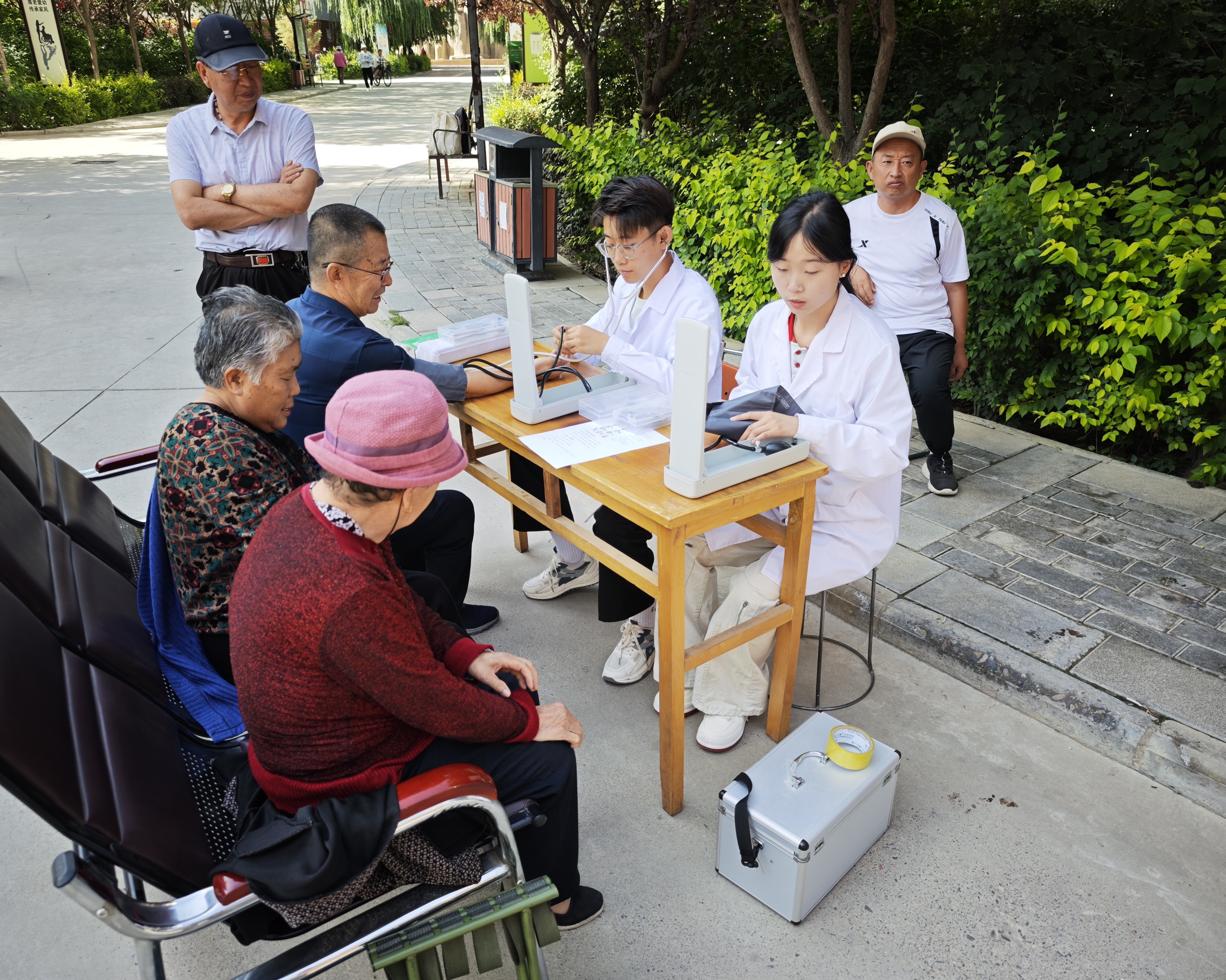 在指導老師的帶領下,志愿者們走進武威市涼州區(qū)窯溝村,他們手持血壓計為村民細心測量,指尖傳遞著溫暖的守護。針對常見的高血壓問題,志愿者們將書本的醫(yī)學知識化作“少鹽多醋常走動”的貼心叮嚀;艾灸棒在老人膝蓋處揮舞,老人們微闔雙眼,皺紋間舒展開寧靜的笑意。志愿者精心準備了蘊含中藥智慧的五色香囊,讓預防保健的種子在老人們心中生根發(fā)芽。