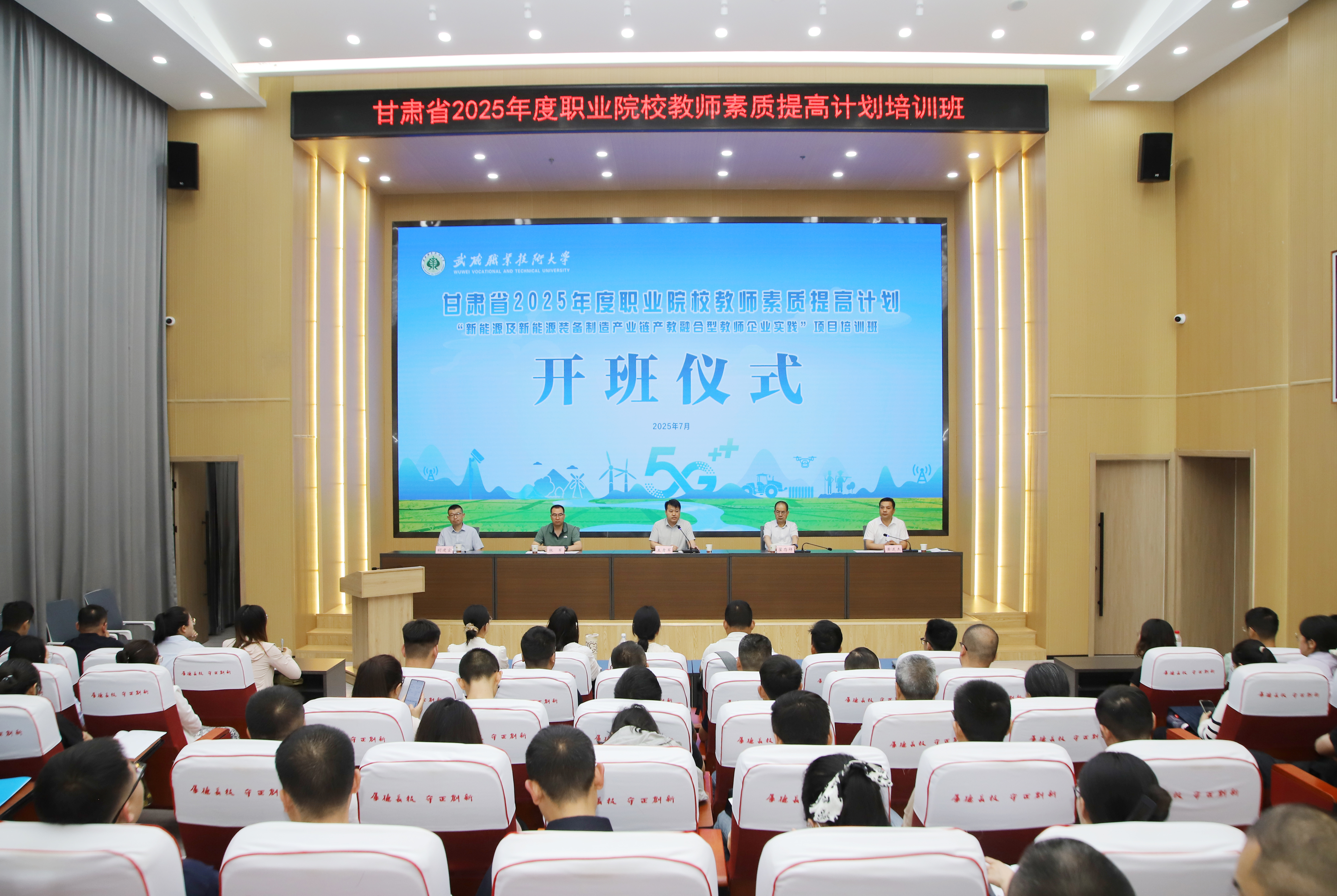 7月21日,由甘肅省教育廳主辦,武威職業(yè)技術(shù)大學(xué)首次承辦的甘肅省2025年度職業(yè)院校教師素質(zhì)提高計(jì)劃“新能源及新能源裝備制造產(chǎn)業(yè)鏈產(chǎn)教融合型教師企業(yè)實(shí)踐”項(xiàng)目培訓(xùn)班在學(xué)校順利開班,培訓(xùn)旨在提升教師產(chǎn)教融合、實(shí)踐教學(xué)、技術(shù)創(chuàng)新與服務(wù)的意識和能力,為甘肅省職業(yè)院校新時代高素質(zhì)專業(yè)化教師隊(duì)伍建設(shè)提供有力支撐。黨委副書記翟存祥,甘肅省職業(yè)院校教師素質(zhì)提高計(jì)劃管理辦公室負(fù)責(zé)人及專家出席開班儀式,來自全省16所職業(yè)技術(shù)大學(xué)(學(xué)院)的120名骨干教師參加培訓(xùn)。中科低碳新能源技術(shù)學(xué)院院長黃述杰主持開班儀式。