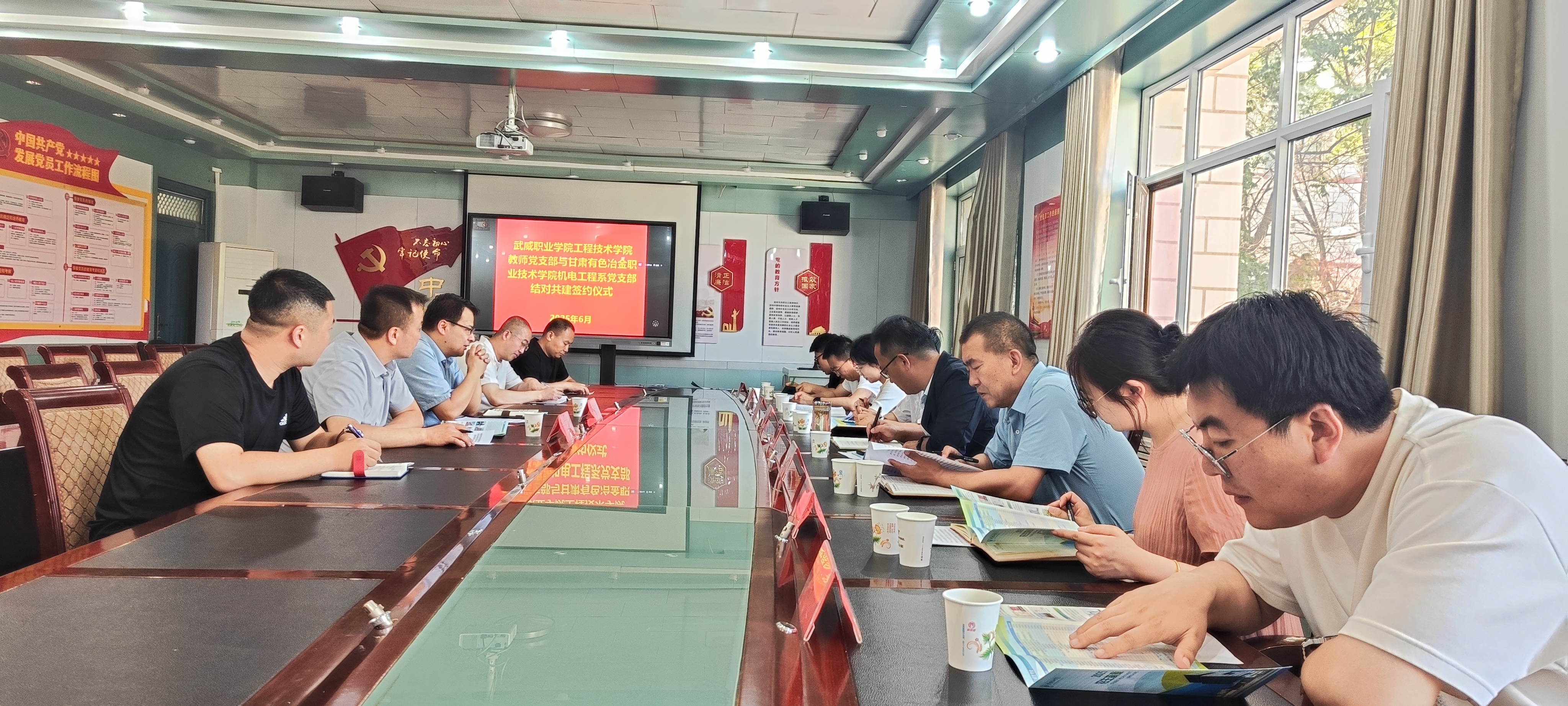 為進一步加強黨組織建設,提升黨員的政治素養(yǎng)和黨性修養(yǎng),6月11日,學校工程技術學院教師黨支部和甘肅有色冶金職業(yè)技術學院機電工程系黨支部結對共建簽約儀式在博學樓黨員活動室舉行。甘肅有色冶金職業(yè)技術學院組織部部長高立兵、督導中心主任趙登峰、機電工程系黨支部書記侯婷婷,學校工程技術學院黨總支書記王鐸云、副院長徐生龍出席儀式,雙方黨員共計20人參加儀式。