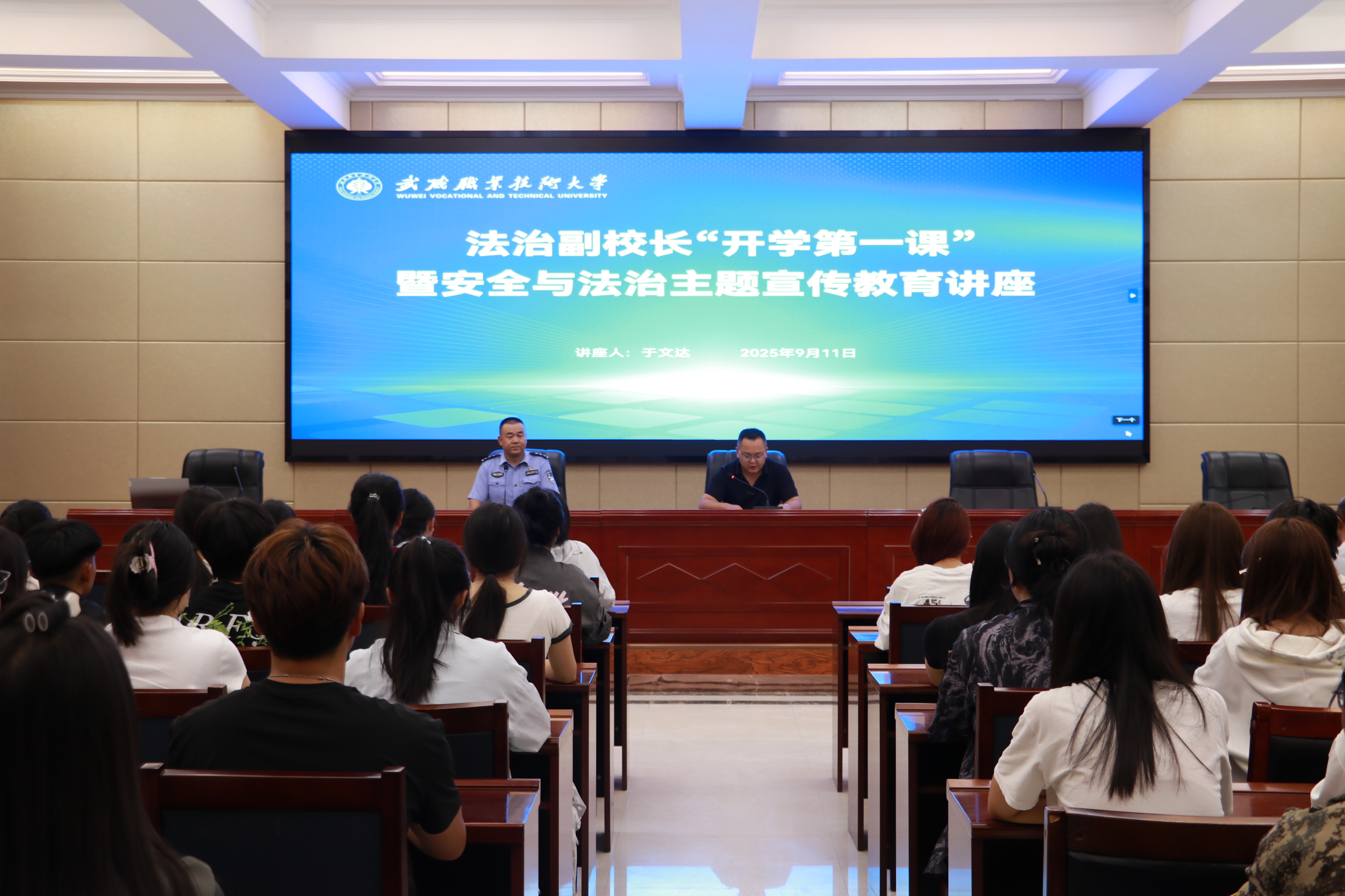 為加強師生法治觀念,提高安全意識,9月11日,學(xué)校安全保衛(wèi)處邀請法治副校長于文達為學(xué)校師生講授2025年秋季學(xué)期“開學(xué)第一課”,開展安全與法治教育專題講座?;顒釉谛袠錁潜眰?cè)報告廳舉行,活動由安全保衛(wèi)處副處長康興奎主持。