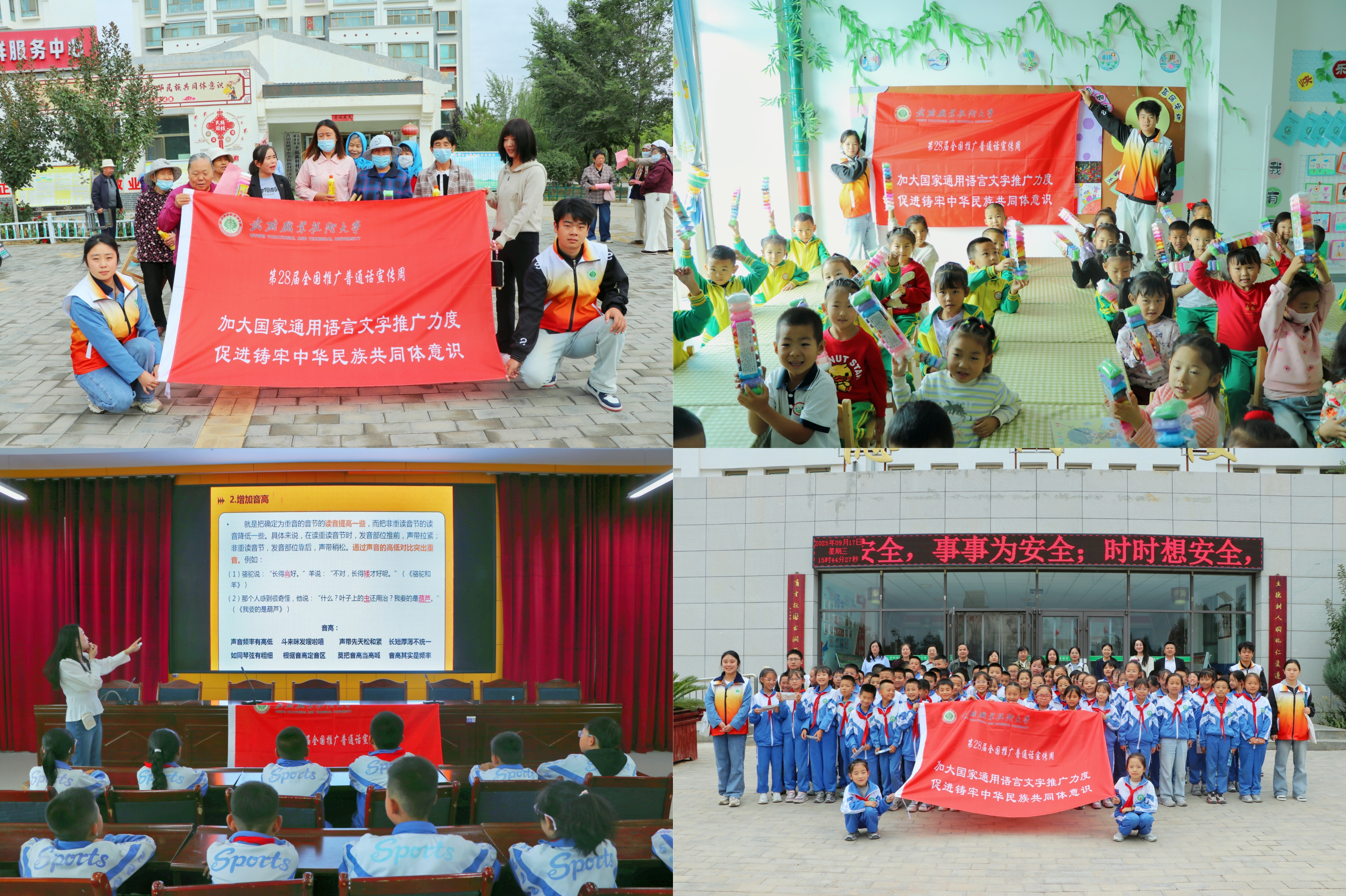 9月17日,武威職業(yè)技術(shù)大學(xué)推普志愿服務(wù)隊(duì)一行赴古浪縣綠洲小鎮(zhèn)幸福新村、康寧新村、綠洲完全小學(xué)及綠洲幼兒園,開展以“加大國家通用語言文字推廣力度,促進(jìn)鑄牢中華民族共同體意識(shí)”為主題的國家通用語言文字推廣活動(dòng),以實(shí)際行動(dòng)助力鄉(xiāng)村振興。
