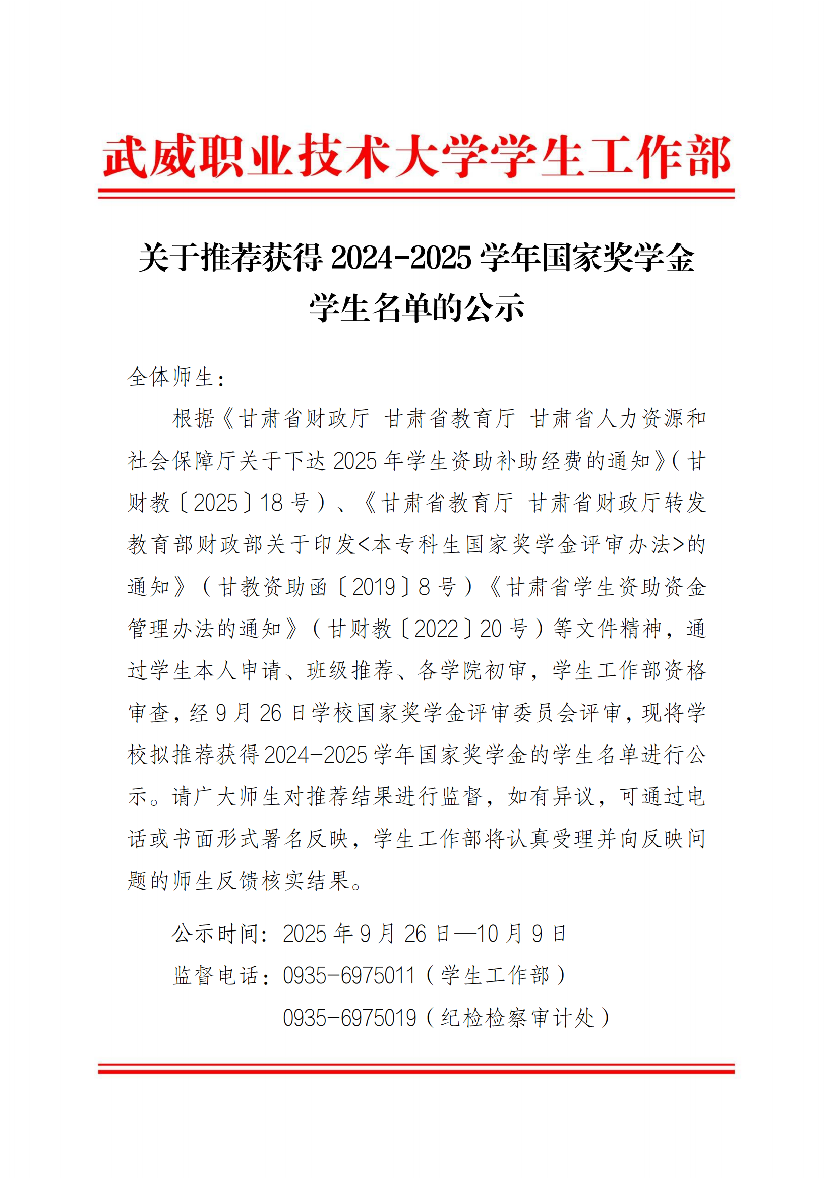 甘肅省武威師范學(xué)校關(guān)于2025-2026學(xué)年國家助學(xué)金評選結(jié)果的公示