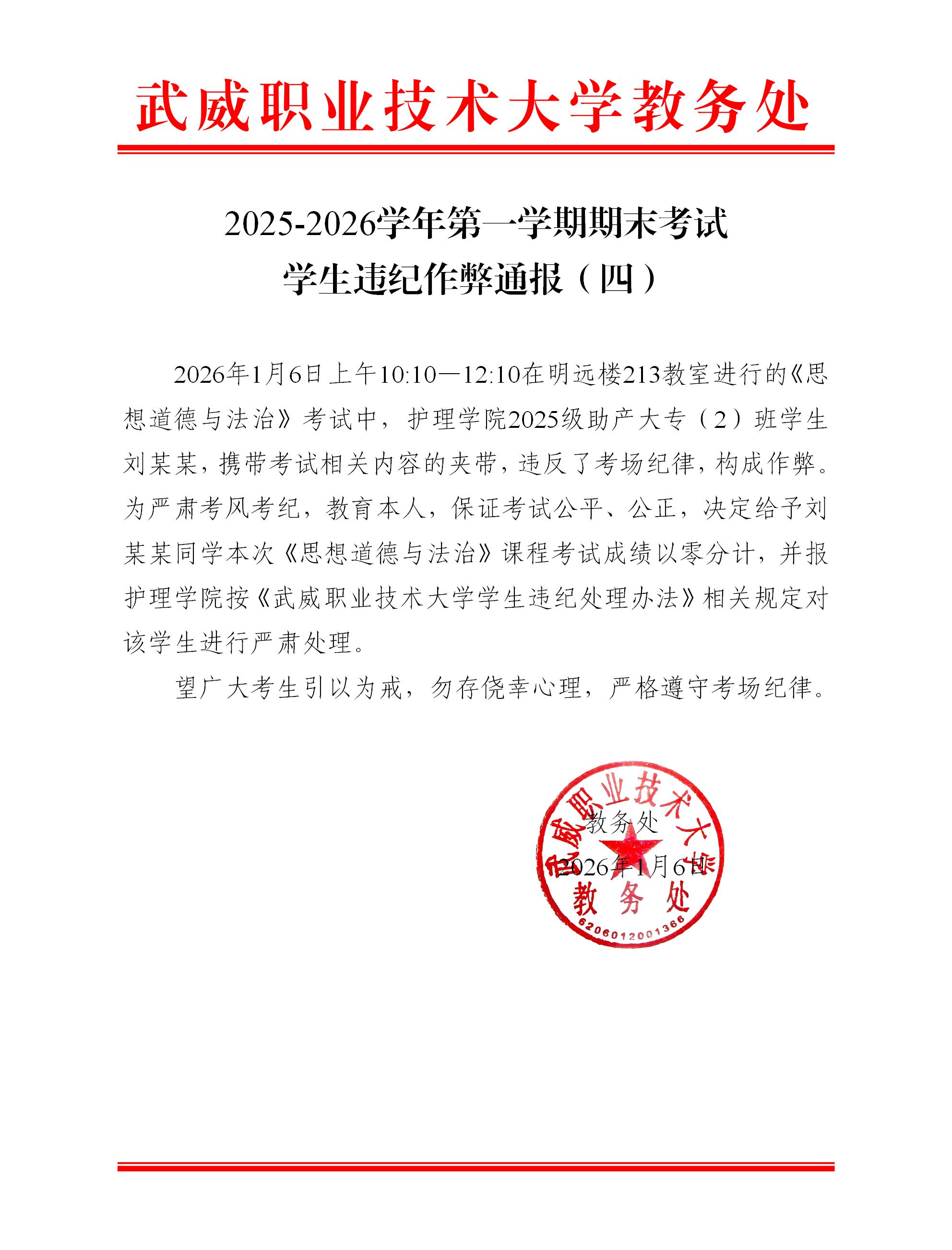 2025-2026學(xué)年第一學(xué)期期末考試學(xué)生違紀(jì)作弊通報(四)