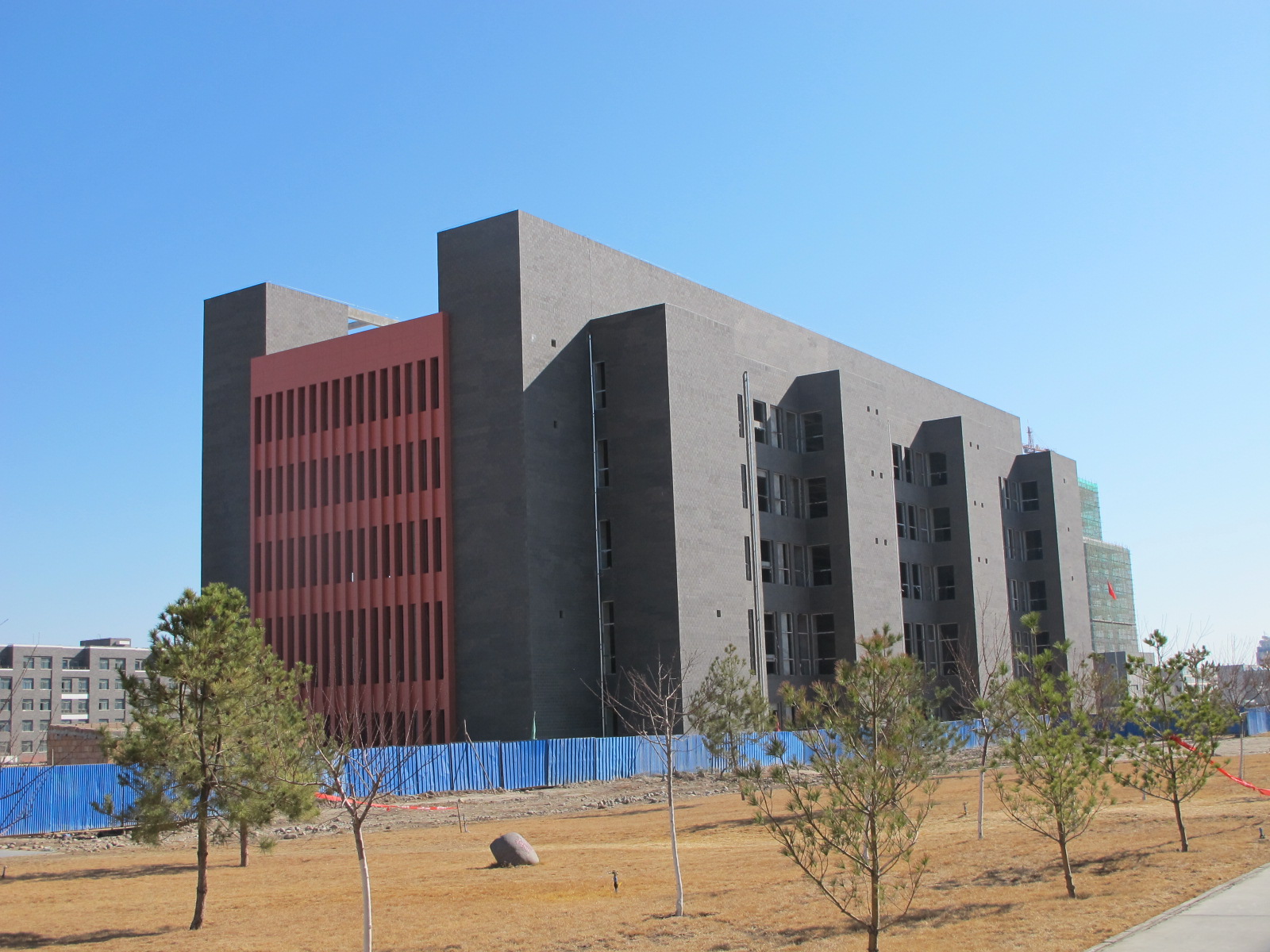 體育館建設(shè)項目已完成外立面檐口的安裝,采用銀灰色2.5mm厚氟碳沖孔鋁單板,已完成玻璃幕墻的安裝,外立面盡顯端莊大氣。復(fù)工后,進(jìn)行一層上人屋面的防水層施工和防滑磚的鋪設(shè),完成一層頂女兒墻玻璃扶手的安裝。圖書館建設(shè)項目已完成外墻陶土劈開磚的粘貼、東西兩側(cè)外立面鋁板裝飾施工。復(fù)工后,繼續(xù)進(jìn)行內(nèi)部施工及裝修。