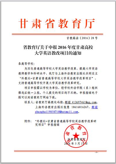 省教育廳關(guān)于申報(bào)2016年度甘肅高校大學(xué)英語(yǔ)教改項(xiàng)目的通知