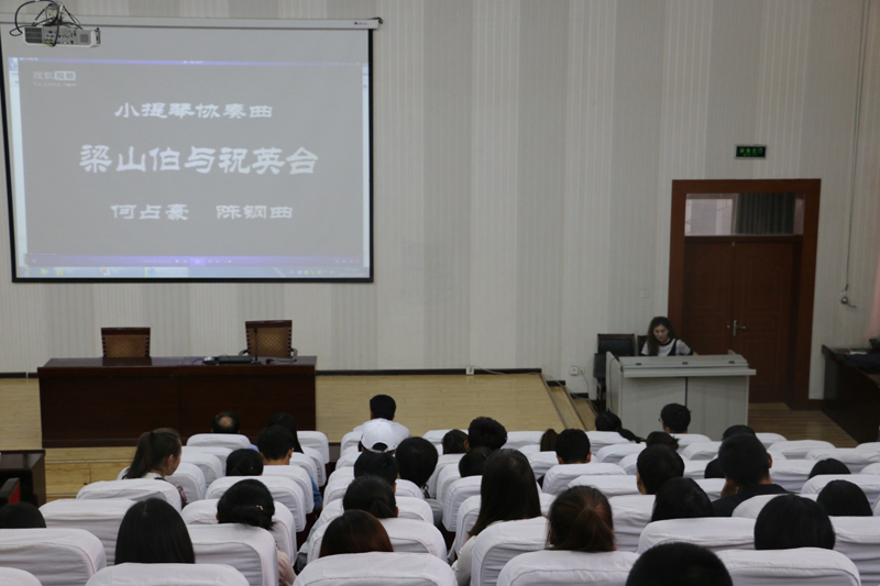 伴著優(yōu)美的音樂(lè)旋律王敏副教授開(kāi)始了講座,王老師首先介紹了音樂(lè)發(fā)展歷史和音樂(lè)鑒賞的基礎(chǔ)知識(shí),然后以我國(guó)著名作曲家陳鋼、何占豪先生創(chuàng)作的小提琴協(xié)奏曲《梁山伯與祝英臺(tái)》為題材,分階段講述了“鳥(niǎo)語(yǔ)花香”、“草橋結(jié)拜”、“英臺(tái)抗婚”、“投墳化蝶”等內(nèi)容和藝術(shù)場(chǎng)景。剖析了作品在管樂(lè)、和以小提琴、大提琴為主的弦樂(lè)及民樂(lè)有機(jī)結(jié)合的高超藝術(shù)境界,講座過(guò)程中王老師結(jié)合《梁祝》協(xié)奏曲音視頻資料,演繹了梁山伯與祝英臺(tái)凄美的愛(ài)情故事。