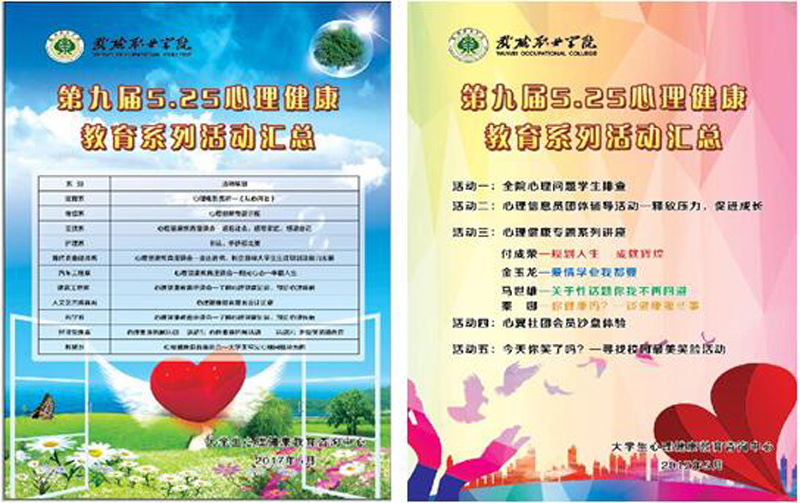 為貫徹落實習近平總書記在全國高校思想政治工作會議上的講話和教育部《關于加強普通高校大學生心理健康教育工作的意見》等文件精神,迎接“5·25”全國大學生心理健康日,提高我院學生心理健康水平,展現我院學生積極向上的精神風貌。學生工作處于5月20日至6月20日開展了第九屆“5·25”心理健康宣傳月系列活動。