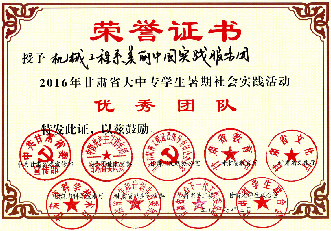 甘肅省大中專(zhuān)學(xué)生暑期社會(huì)實(shí)踐活動(dòng)優(yōu)秀團(tuán)隊(duì)---機(jī)械制造系美麗中國(guó)實(shí)踐服務(wù)團(tuán)