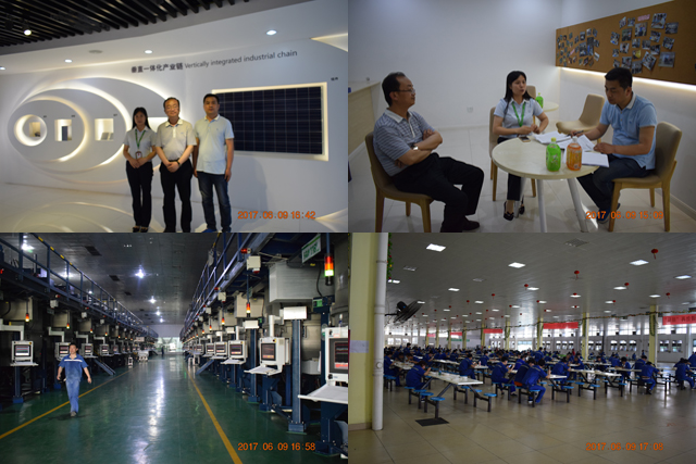 晶科能源控股有限公司是全球?yàn)閿?shù)不多的擁有垂直一體化產(chǎn)業(yè)鏈的光伏制造企業(yè),業(yè)務(wù)涵蓋了優(yōu)質(zhì)的硅錠、硅片、電池片生產(chǎn)、高效單多晶光伏組件制造以及光伏電站建設(shè)等領(lǐng)域,是目前全球光伏組件生產(chǎn)的龍頭企業(yè),2016年中國(guó)500強(qiáng)企業(yè)。公司負(fù)責(zé)人帶領(lǐng)考察人員參觀了公司現(xiàn)代化的生產(chǎn)車間、晶科商學(xué)院、員工宿舍和食堂,介紹了公司的發(fā)展情況和用人需求。在考察過(guò)程中,考察人員就公司給學(xué)生提供的工作崗位、待遇、住宿、安全管理等情況與企業(yè)負(fù)責(zé)人進(jìn)行了深入交流。