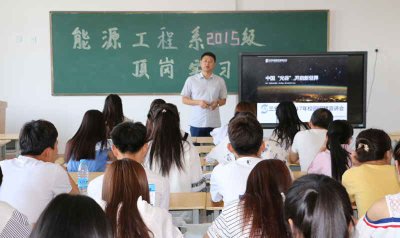 為進(jìn)一步深化校企合作,提供更優(yōu)質(zhì)的頂崗實習(xí)崗位,6月26日早上,能源工程系邀請校企合作企業(yè)安徽三安光電有限公司和晶科能源有限公司工作人員在我系洽談校企合作事宜,并對即將進(jìn)入實習(xí)的2015級學(xué)生做頂崗實習(xí)宣講。
