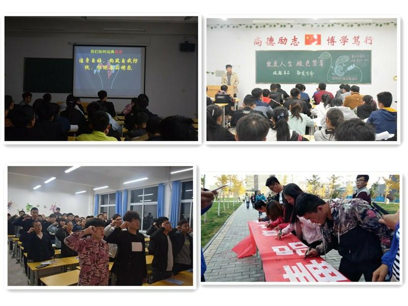 學院以引導學生樹立健康人生理念、創(chuàng)造綠色無毒生活為宗旨,認真開展了毒品預防教育“五個一”活動。10月16日晚,各班以問答、演講、辯論、PPT等多種形式開展了以“健康人生,綠色無毒”為主題的班會并莊嚴宣誓——珍愛生命,遠離毒品,堅決禁毒;10月17日晚,學院組織同學們觀看了禁毒影視劇,并設置知識競賽環(huán)節(jié),同學們參加踴躍;10月18日下午,學院在明德樓前舉行禁毒宣傳簽名活動,學院院長董海鷹簽名并與同學們親切交談?;顒悠陂g,學院還開展以“健康人生、綠色無毒”為主題的禁毒征文比賽,并對優(yōu)秀作品在學院官方QQ、微信、宣傳欄等平臺進行展示和粘貼。此次禁毒活動宣傳形式廣泛,同學們參與度高,宣傳效果明顯。