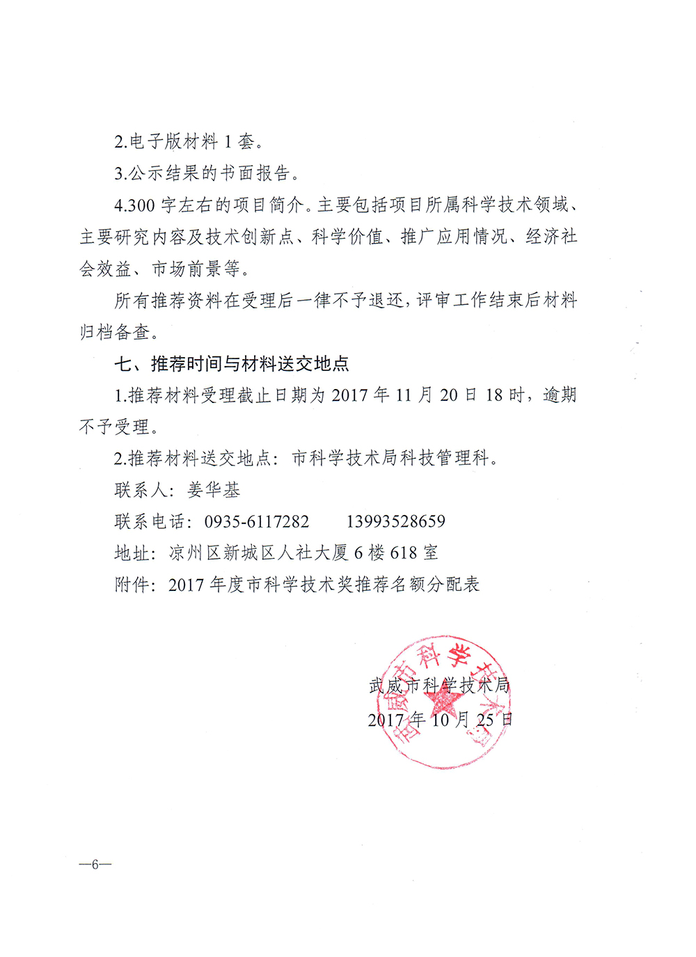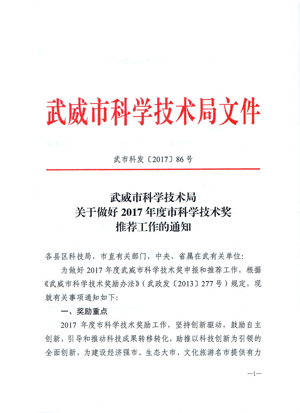 關(guān)于做好2017年度武威市科學(xué)技術(shù)獎(jiǎng)推薦工作的通知
