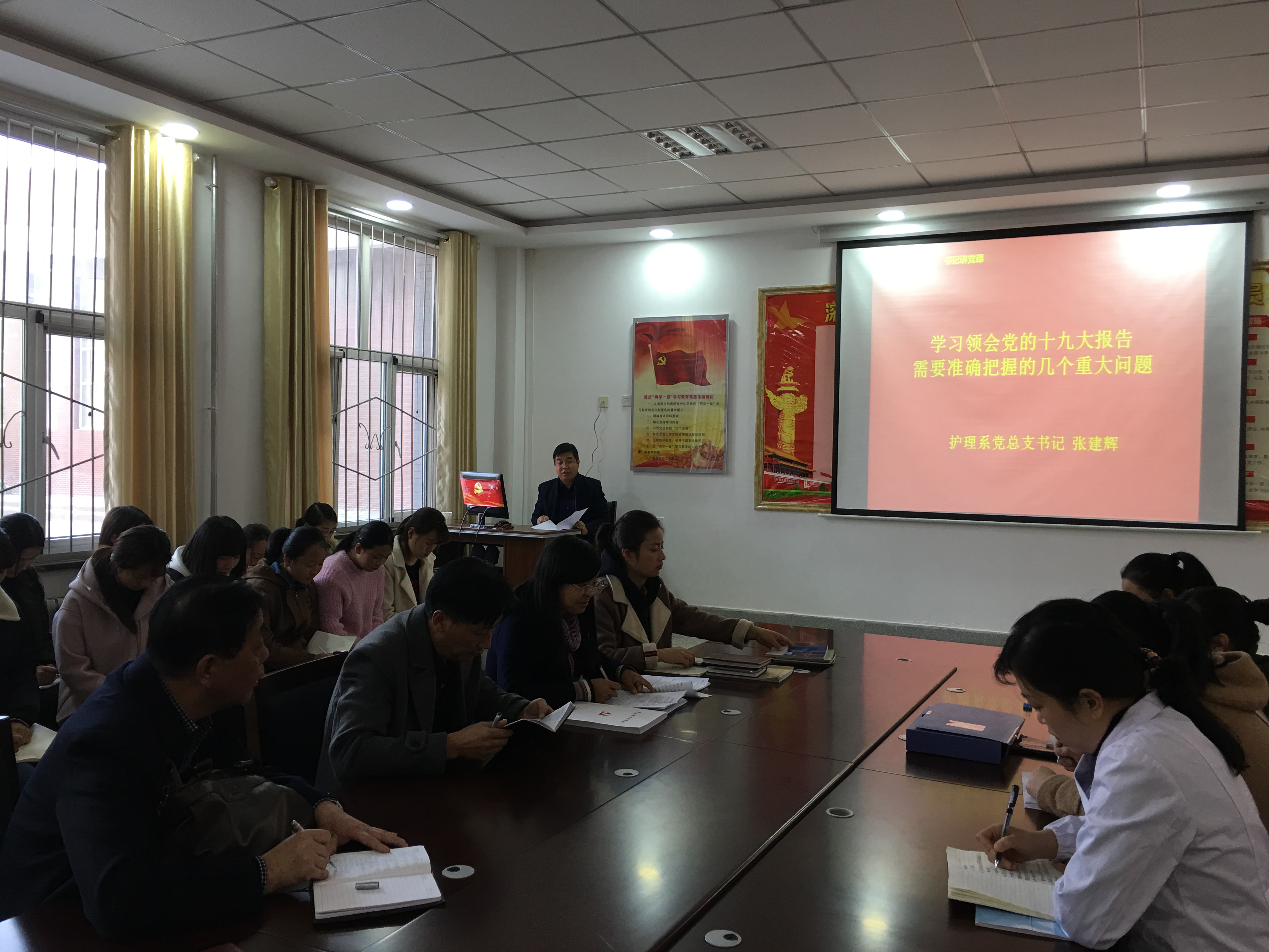 11月17日,護(hù)理系黨支部支召開全體黨員大會(huì),黨總支書記張建輝講黨課,就《學(xué)習(xí)領(lǐng)會(huì)黨的十九大報(bào)告需要準(zhǔn)確把握的幾個(gè)重大問題》進(jìn)行專題黨課輔導(dǎo),促進(jìn)全體黨員對(duì)十九大精神的學(xué)習(xí)理解。護(hù)理系入黨積極分子聆聽了黨課。