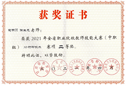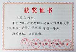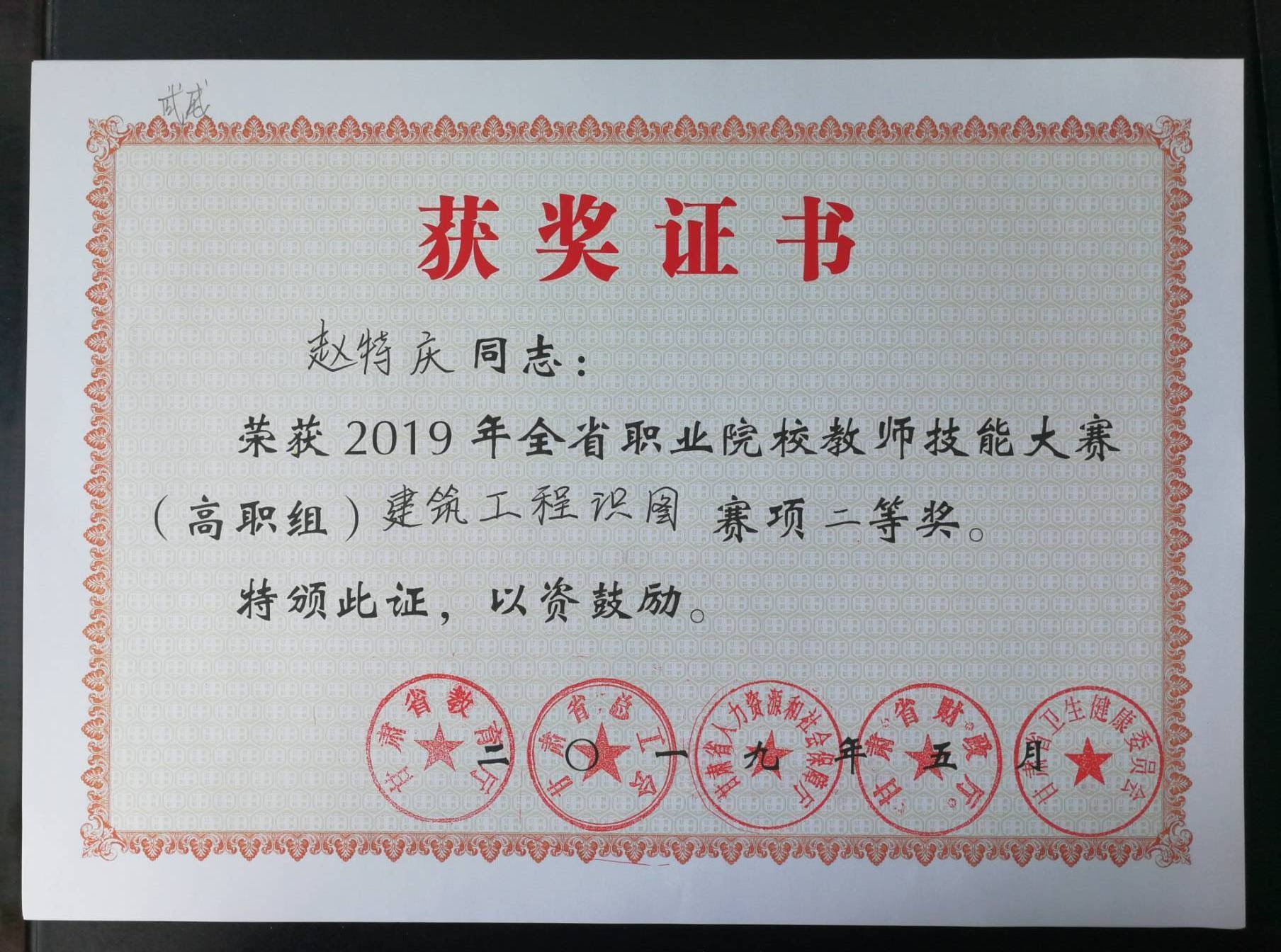 項目組成員趙特慶2019年5月榮獲2019年全省職業(yè)院校教師技能大賽(高職組)建筑工程識圖賽項二等獎