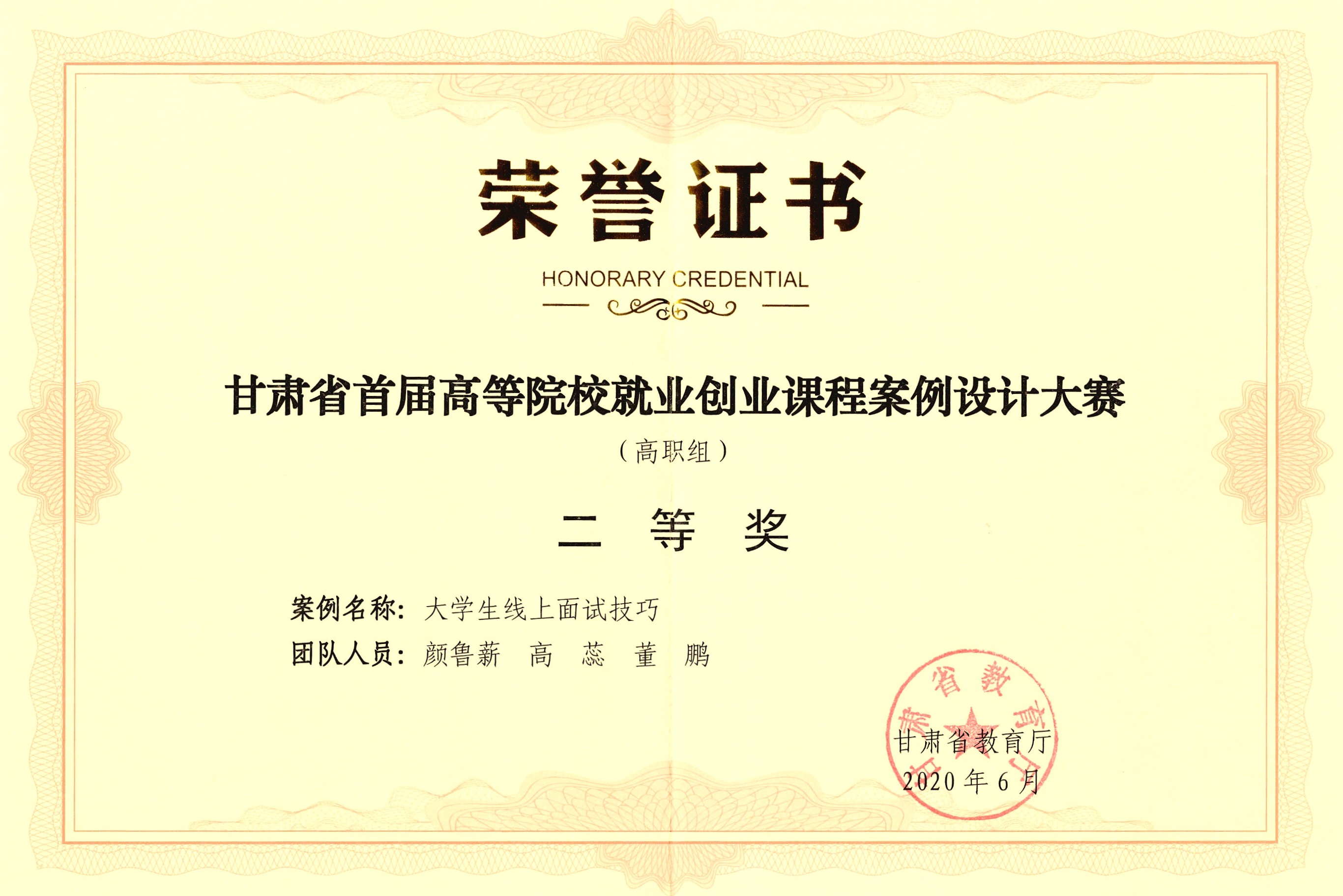3.項目組成員董鵬2020年6月撰寫案例《大學生線上面試技巧》榮獲甘肅省首屆高等院校就業(yè)創(chuàng)業(yè)課程案例設計大賽(高職組)二等獎