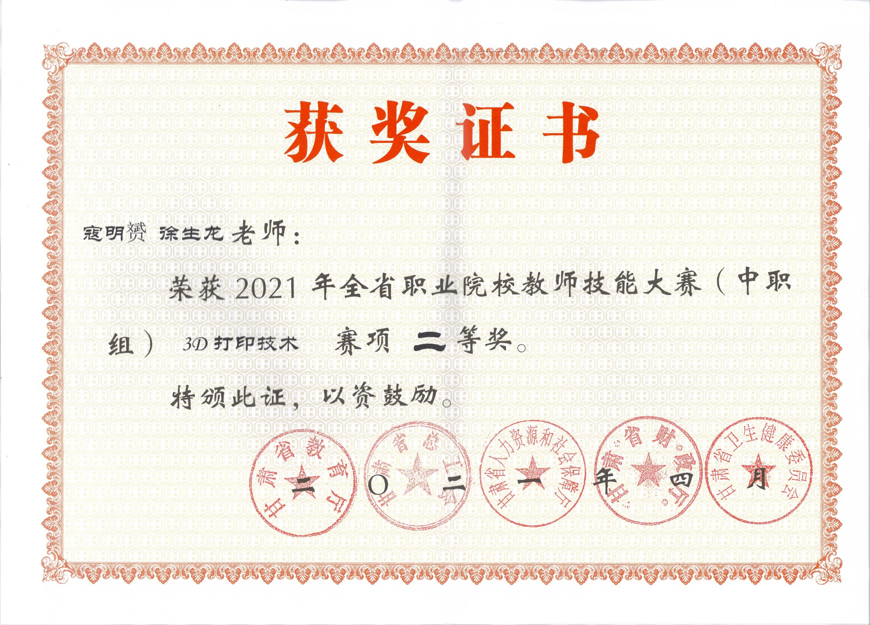 項目組成員徐生龍2021年4月獲甘肅省技能大賽二等獎