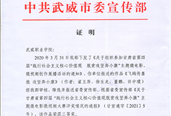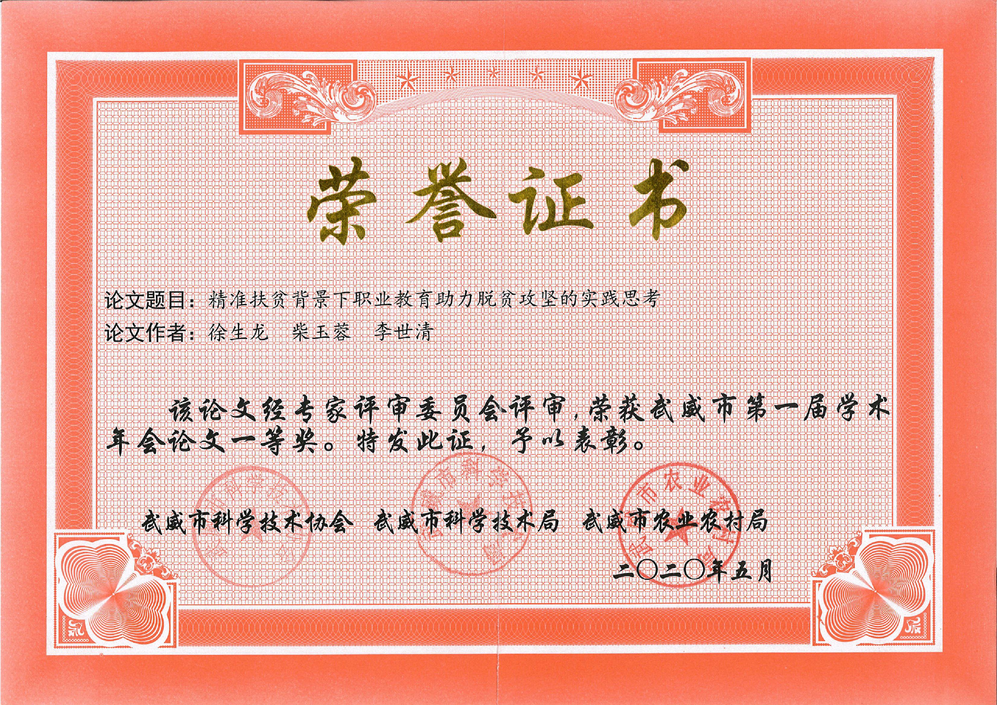 項目組成員徐生龍撰寫的論文《精準扶貧背景下職業(yè)教育助力脫貧攻堅的實踐思考》被評為武威市第一屆學術年會論文一等獎