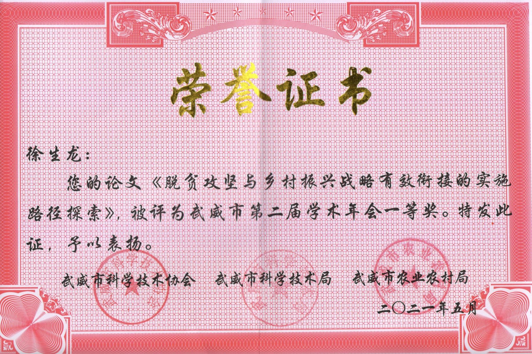 8.項目負責人徐生龍撰寫的論文《脫貧攻堅與鄉(xiāng)村振興戰(zhàn)略有效銜接的實施路徑探索》被評為武威市第二屆學術年會一等獎