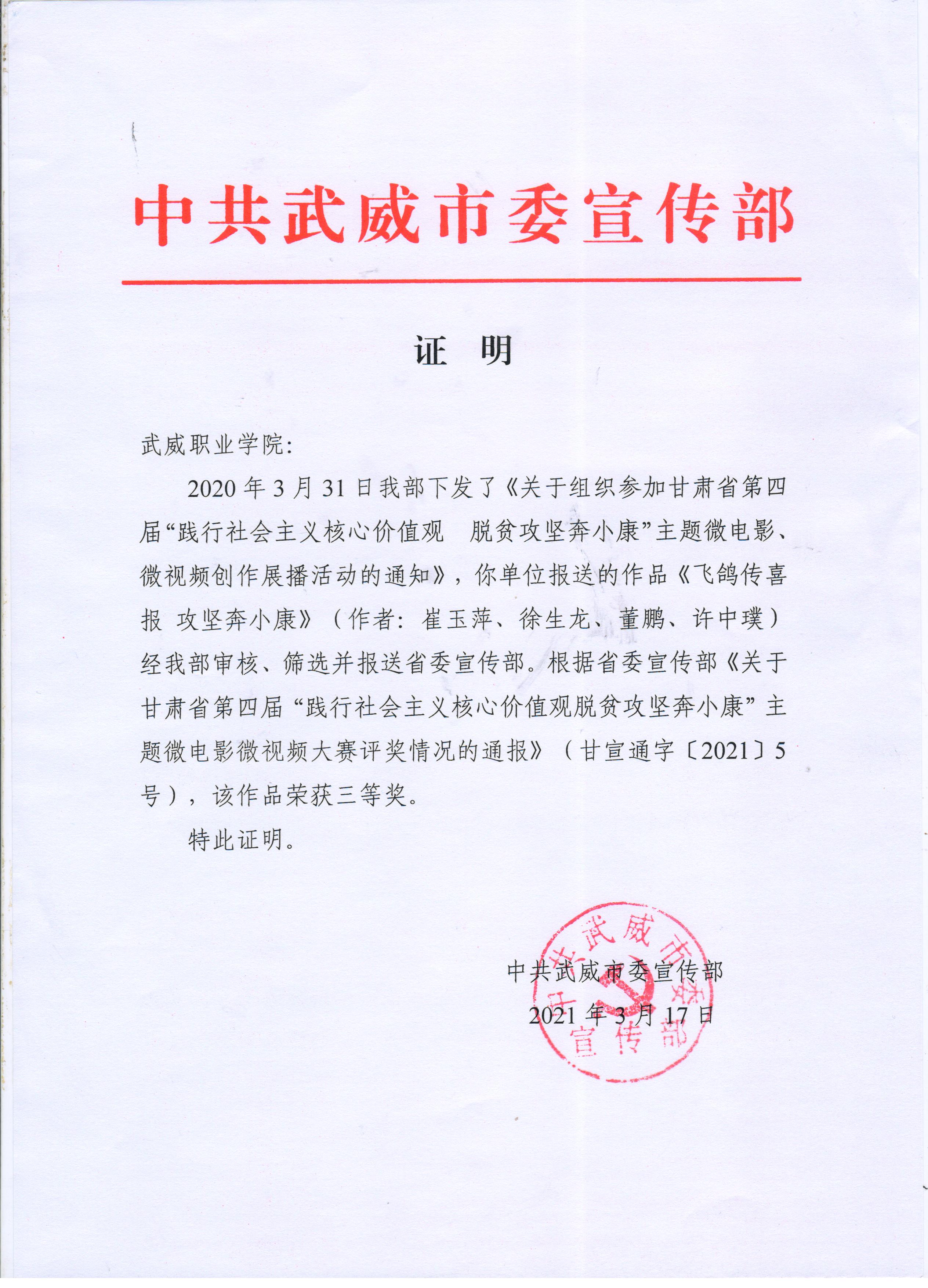 9.項目組負責人徐生龍、崔玉萍、董鵬2021年3月制作的《飛鴿傳喜報 攻堅奔小康》在《關于甘肅省第四屆“踐行社會主義以核心價值觀脫貧攻堅奔小康”主題微電影視頻大賽》榮獲三等獎