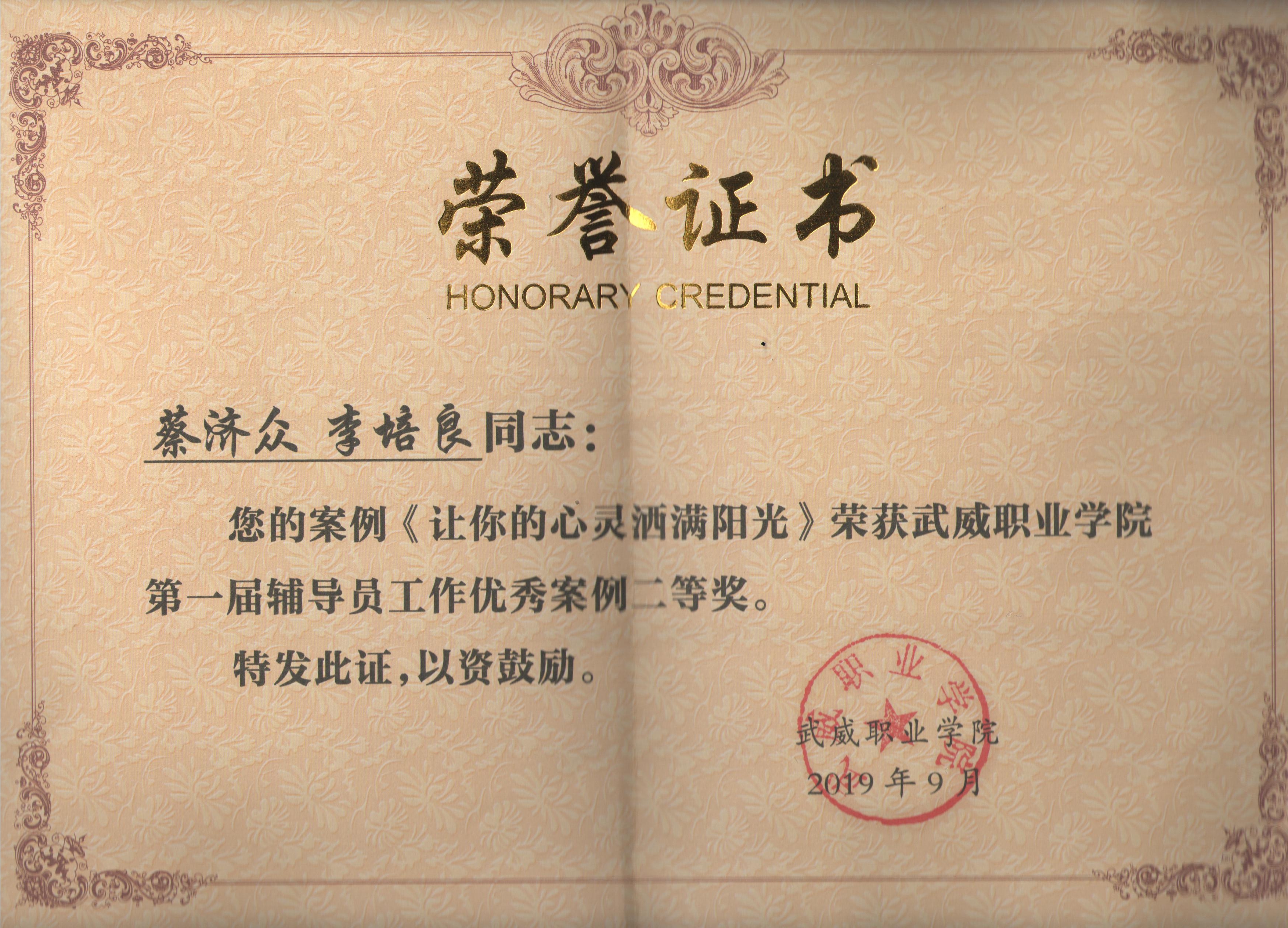 12.項目組成員蔡濟眾2019年9月撰寫的《讓你的心靈灑滿陽光》榮獲武威職業(yè)學院第一屆輔導員工作優(yōu)秀案例二等獎